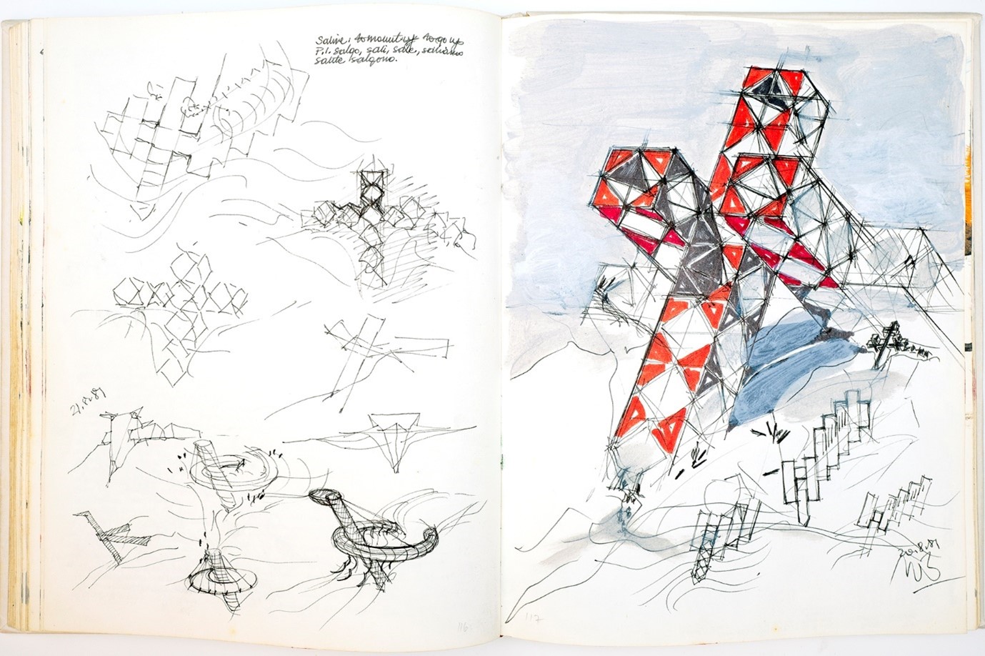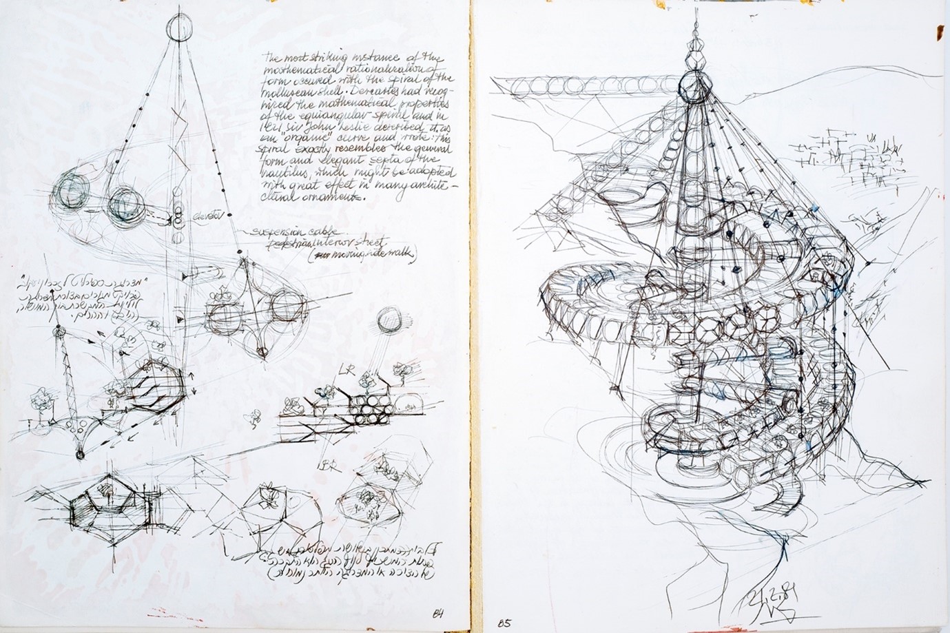 The article includes a focus on Hecker's 46 sketchbooks, compiled from 1979 to 2012, which served as a comprehensive record of his creative process, blending real and imagined architectural explorations. The spiral appears obsessively throughout his sketches, capturing an embryonic architectural vision that evolves yet remains conceptually incomplete. His axonometric drawings reveal a stratified intellectual pursuit, integrating artistic, cultural, and philosophical dimensions.