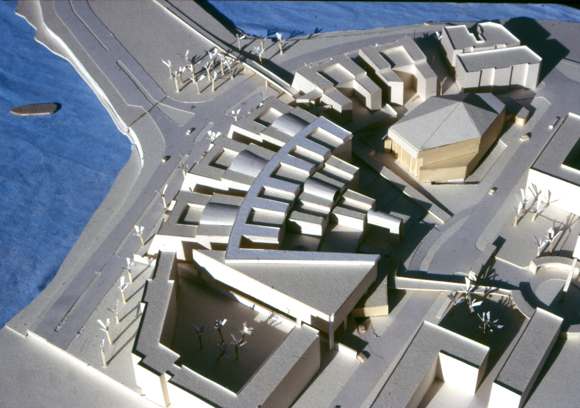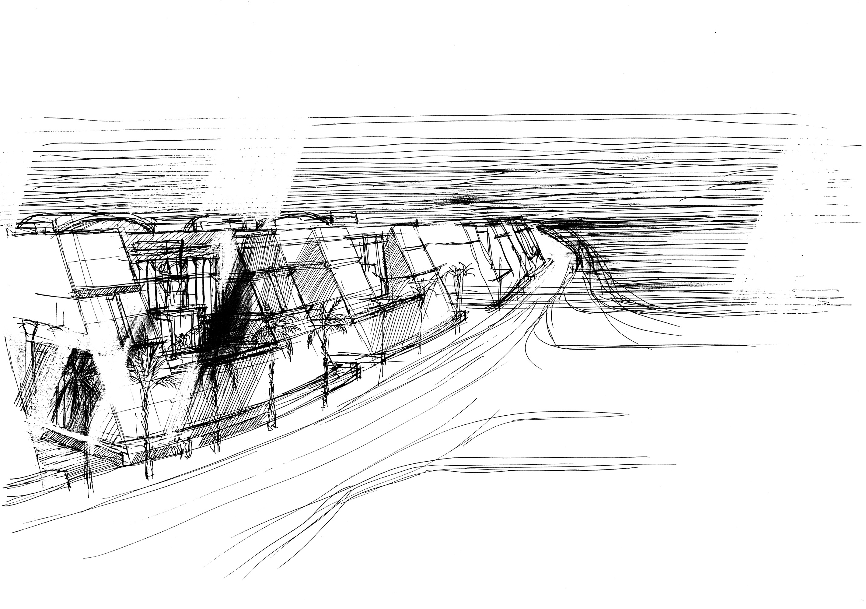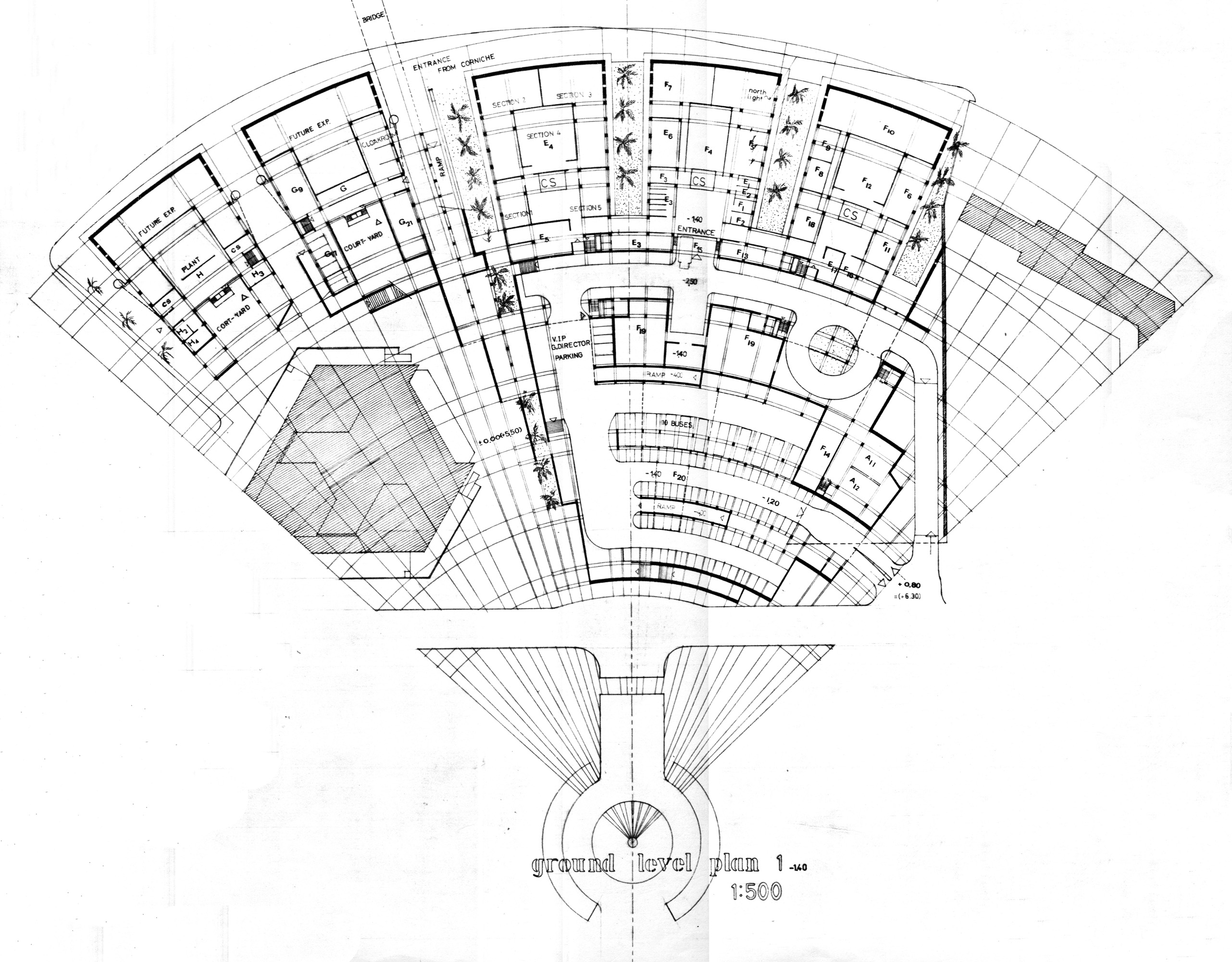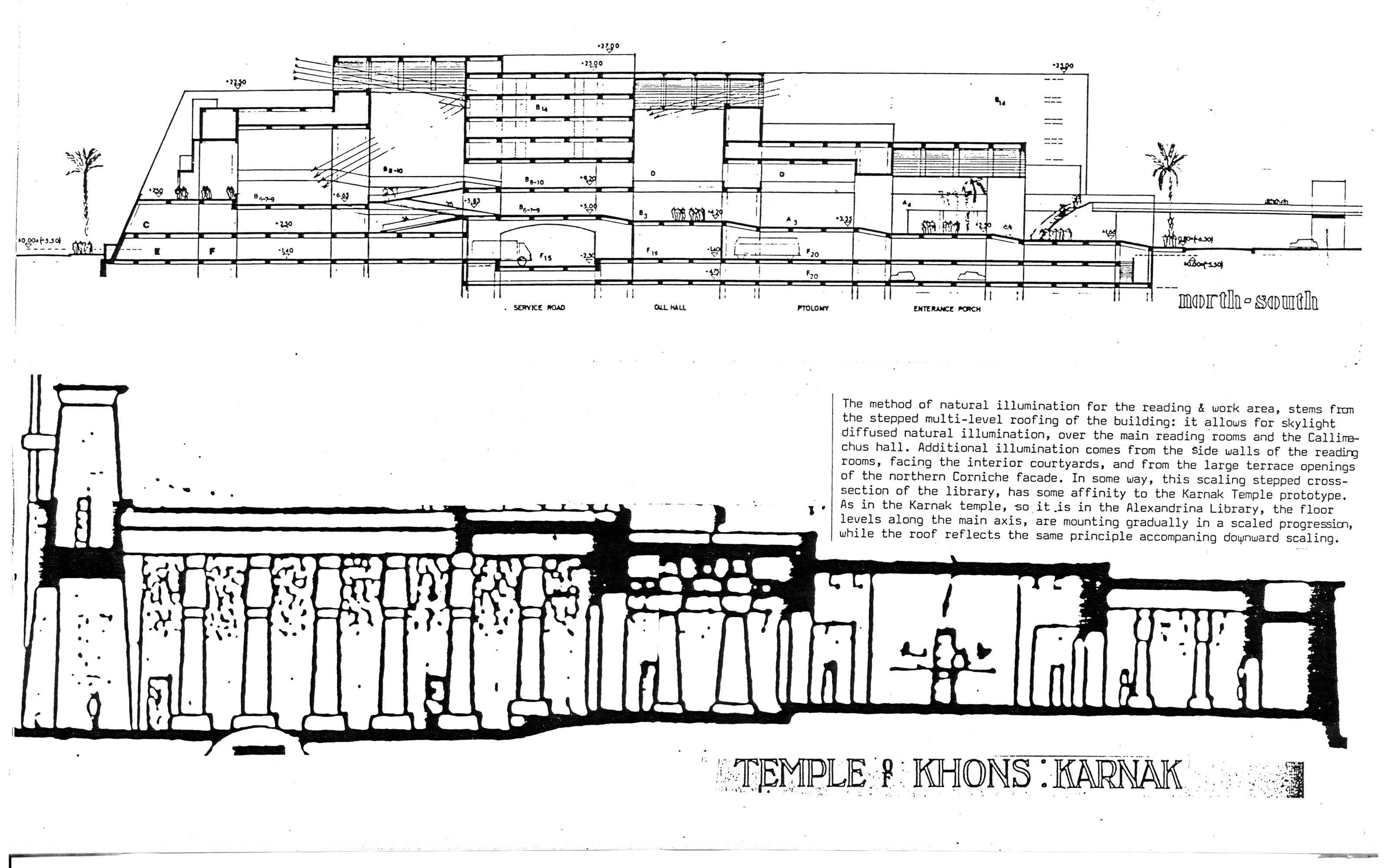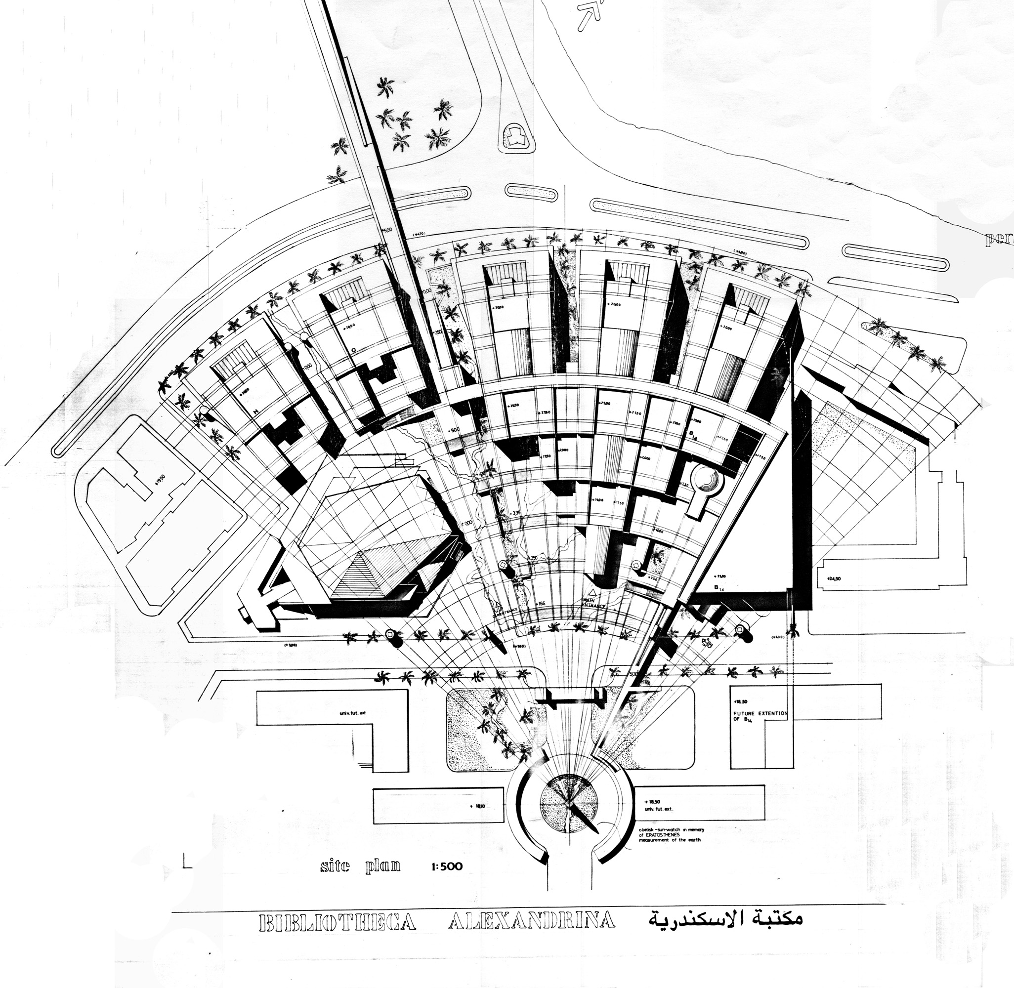 The land allocated for the Library complex is characterized by the proximity to the sea, on the waterfront of the CORNICHE, at the point where the finger-peninsula of ancient Lochias and Selselah-Garden touches the shore-line. The location is most central in the urban fabric of the greater Alexandria city, and constitutes a gap of discontinuity in the architectural built mass of the Corniche facade facing the sea. The proposed Library-design interlocks the architectural flow of the Corniche building continuity.