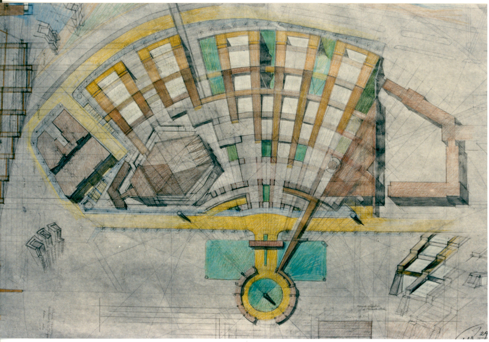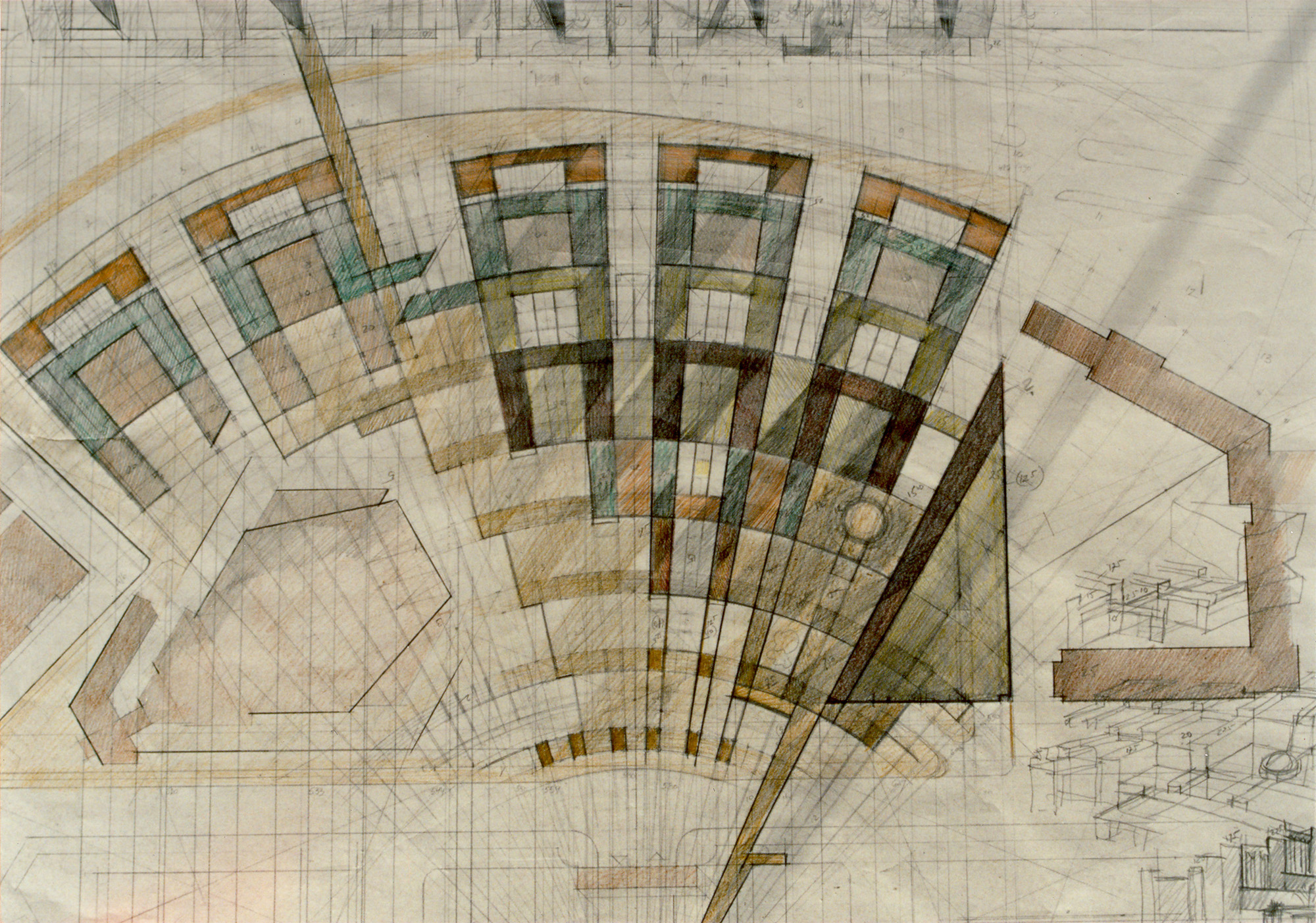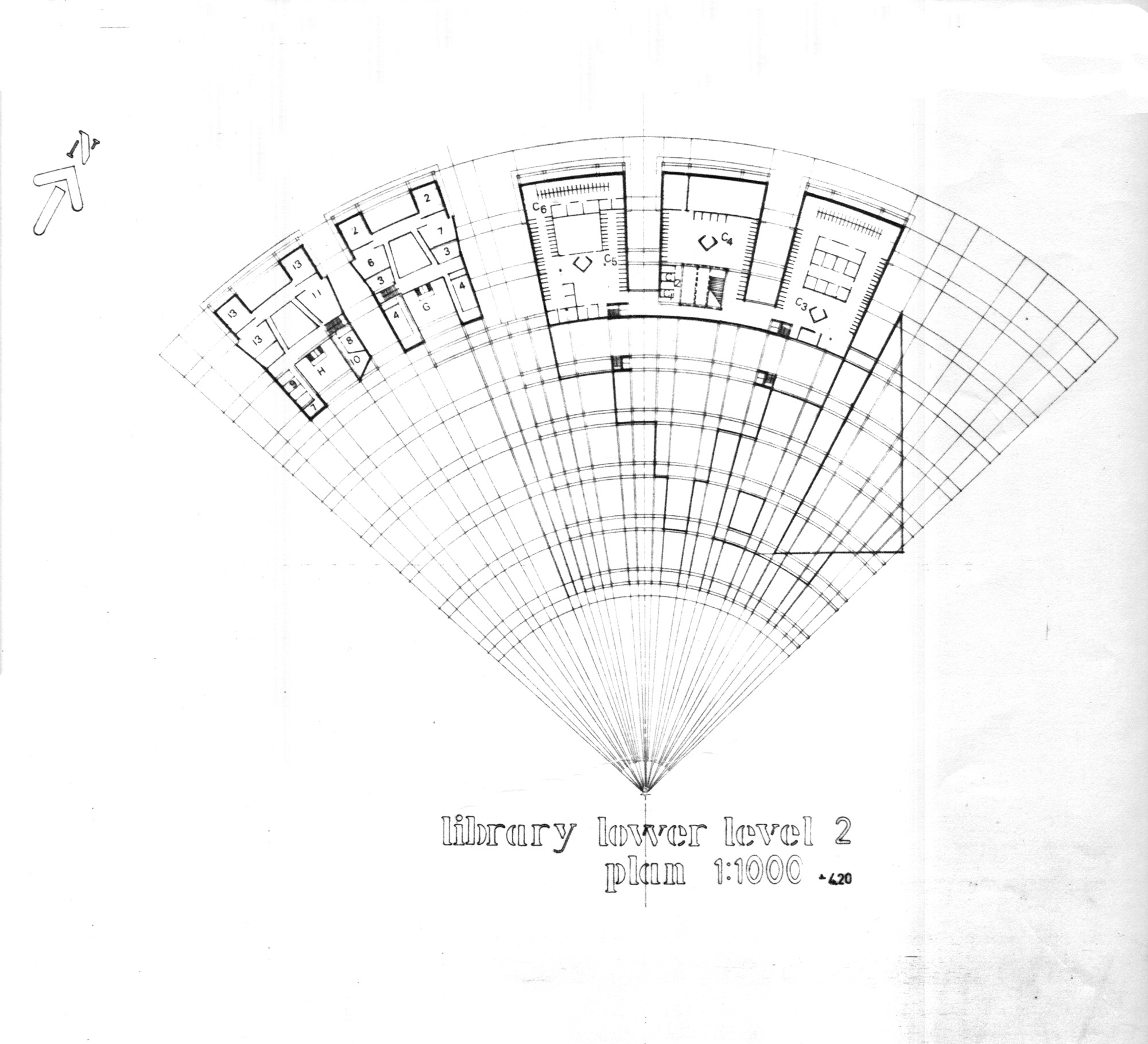 The proposed layout of the library complex follows and echoes the convex curvature of the Corniche, whose centre is located within the middle of the university circle, on its main south-north axis. As a result, a fan-like lattice of radii and circles is created which serves as a coherent organisational system of the complex program. The fan-like lattice also possesses meta-formal layers of meaning, which support the symbolic architectural expression of this library. It is the unique spread of the Delta of the Nile.