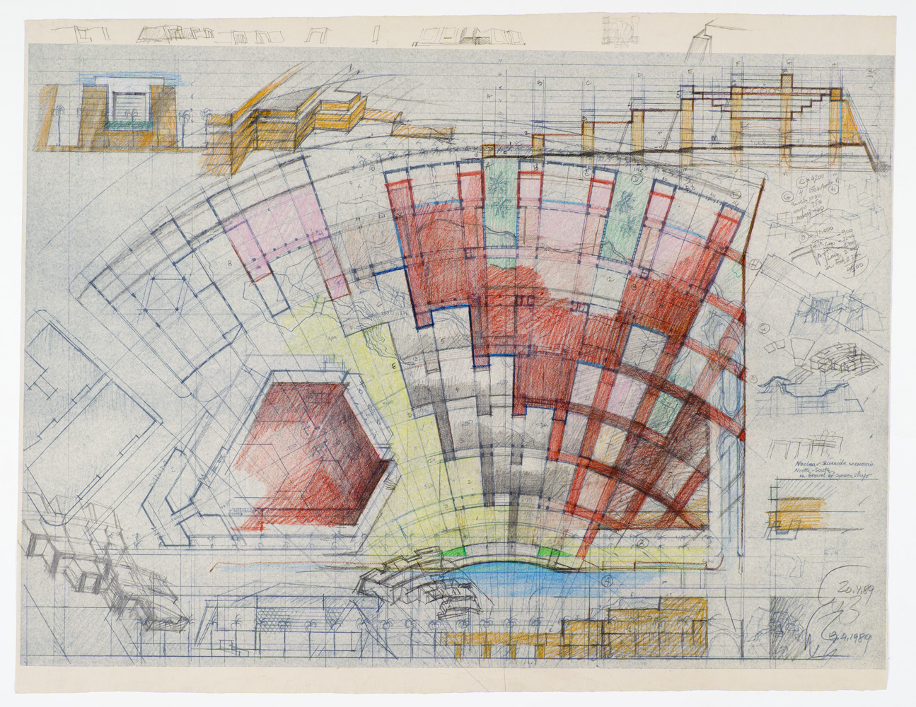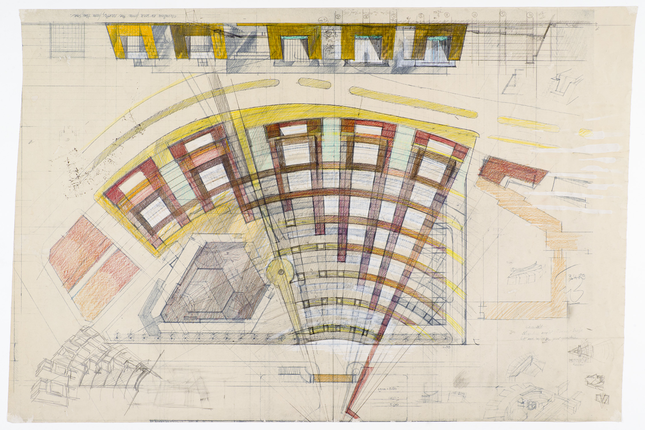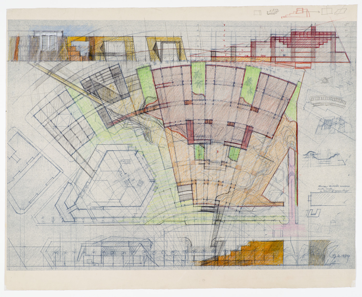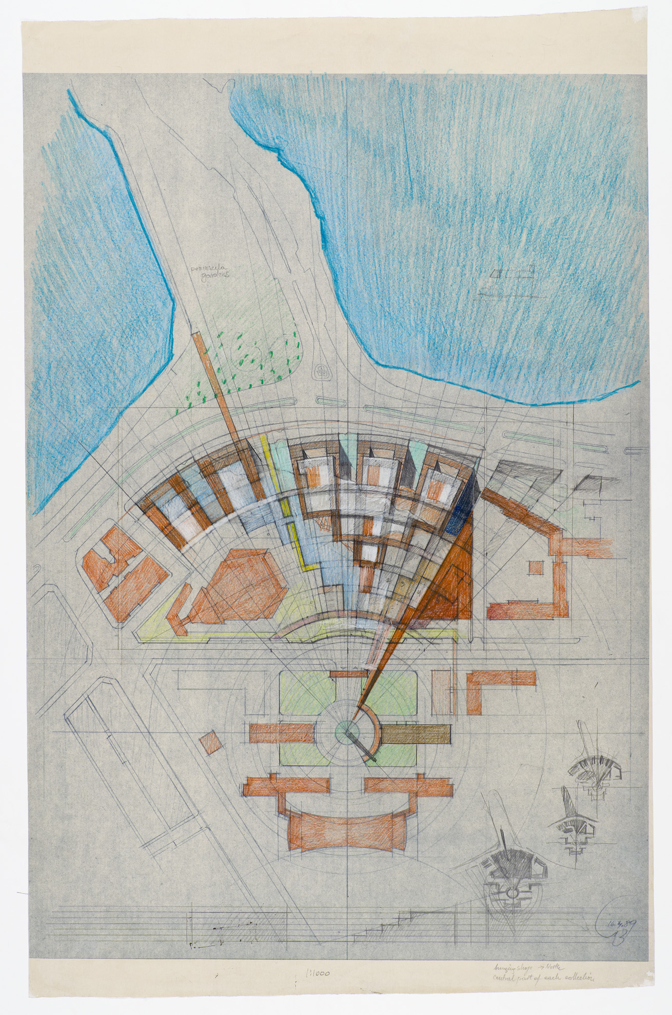 The proposed layout of the library complex follows and echoes the convex curvature of the Corniche, whose centre is located within the middle of the university circle, on its main south-north axis. As a result, a fan-like lattice of radii and circles is created which serves as a coherent organisational system of the complex program. The fan-like lattice also possesses meta-formal layers of meaning, which support the symbolic architectural expression of this library. It is the unique spread of the Delta of the Nile.