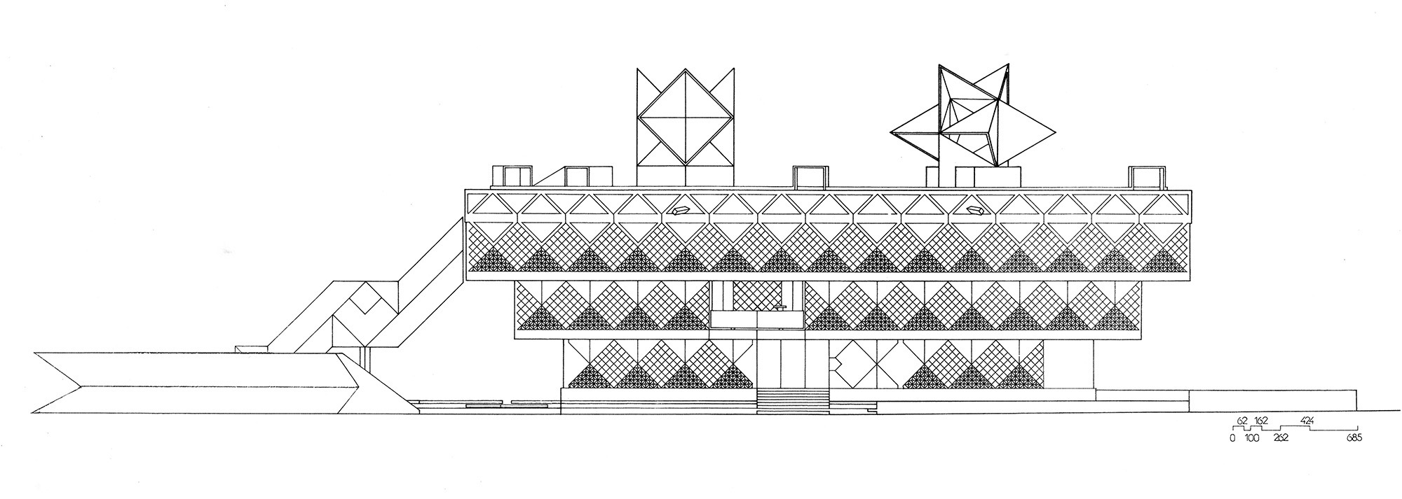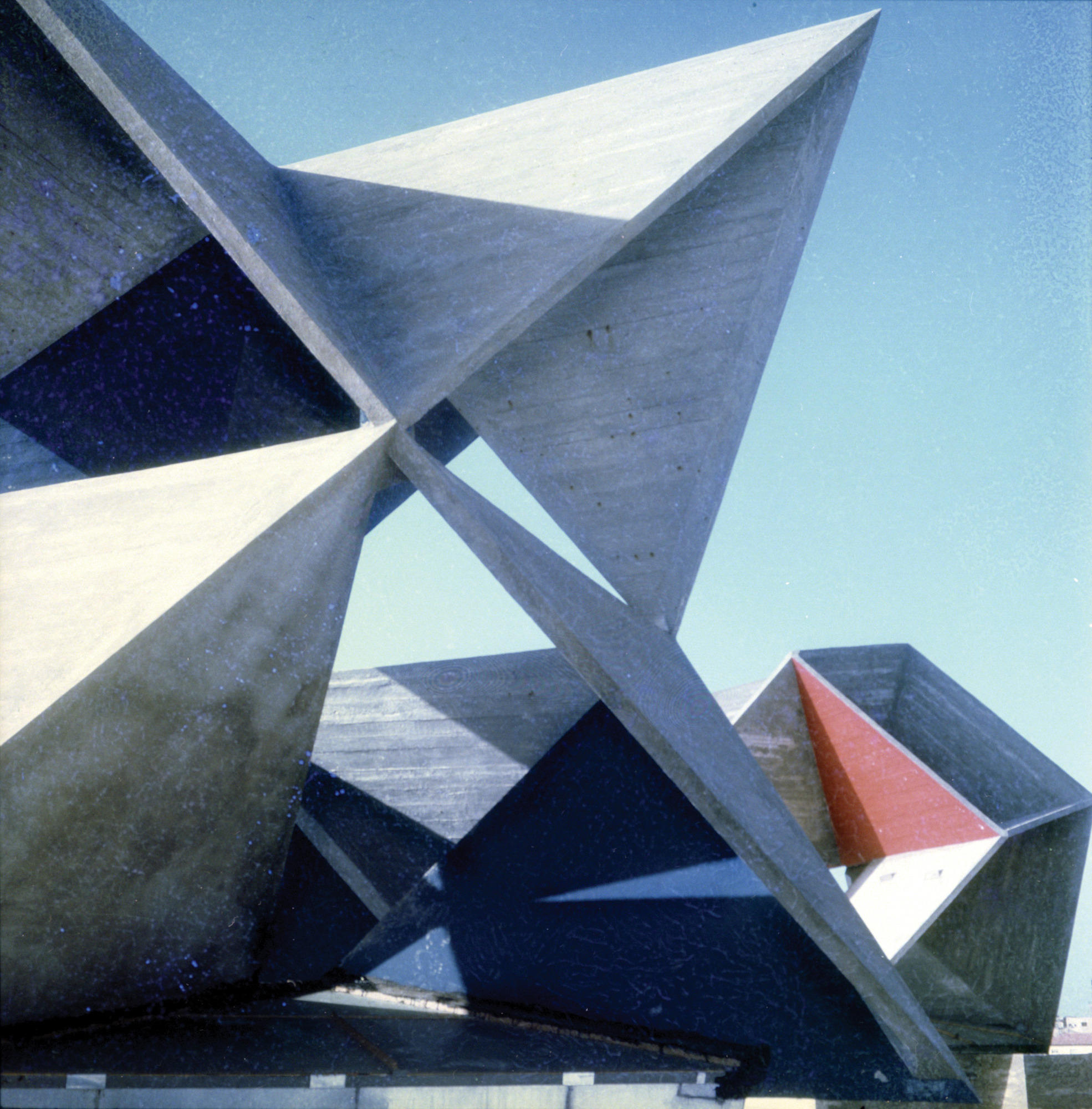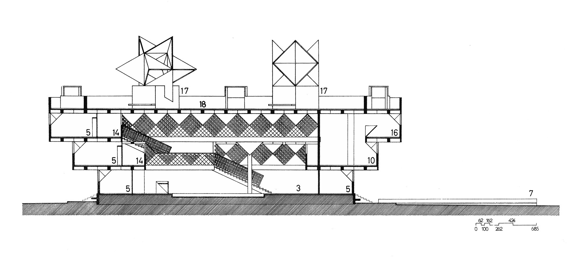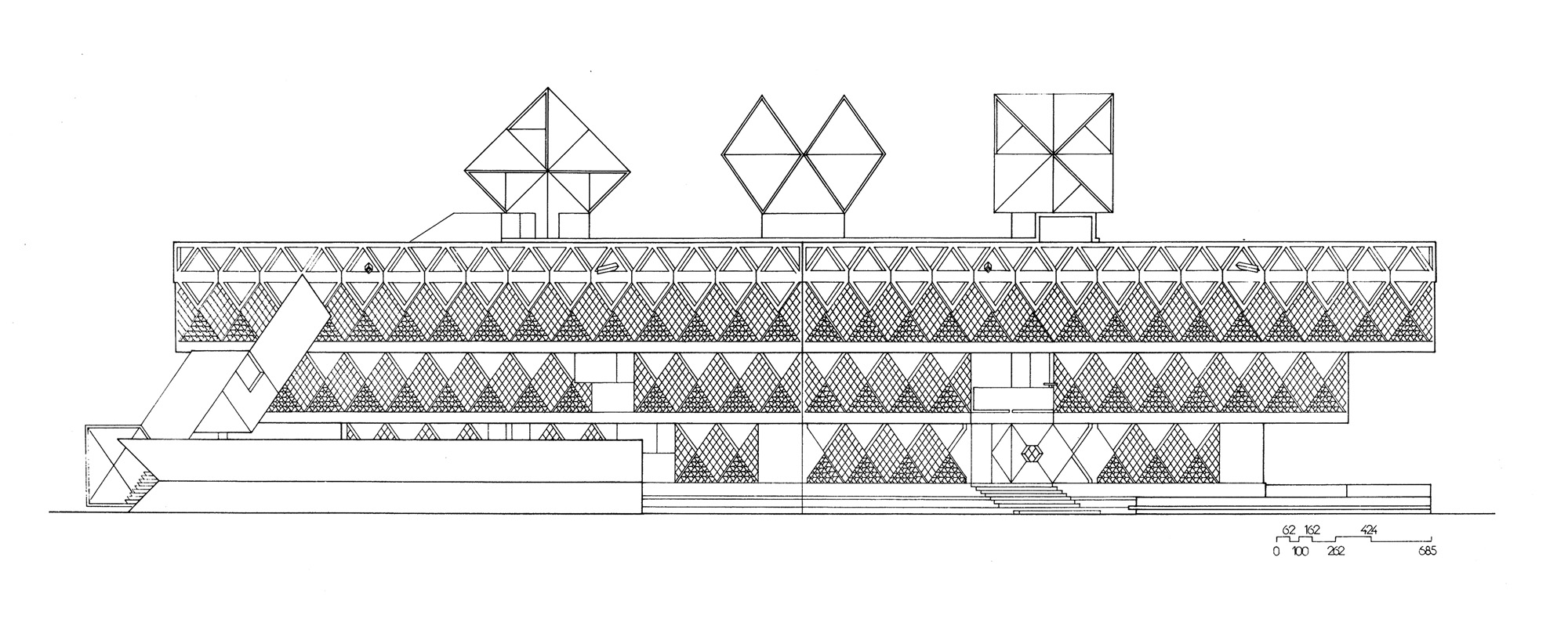 The building is in the shape of an inverted ziggurat built of reinforced concrete, cast in-situ and left natural. The stereometric basic element is based on the shape of a cuboctahedron. The building is supported only by 12 columns. All the floors are in reinforced concrete diagonal ribs, 23 cm wide and 37 cm thick.
