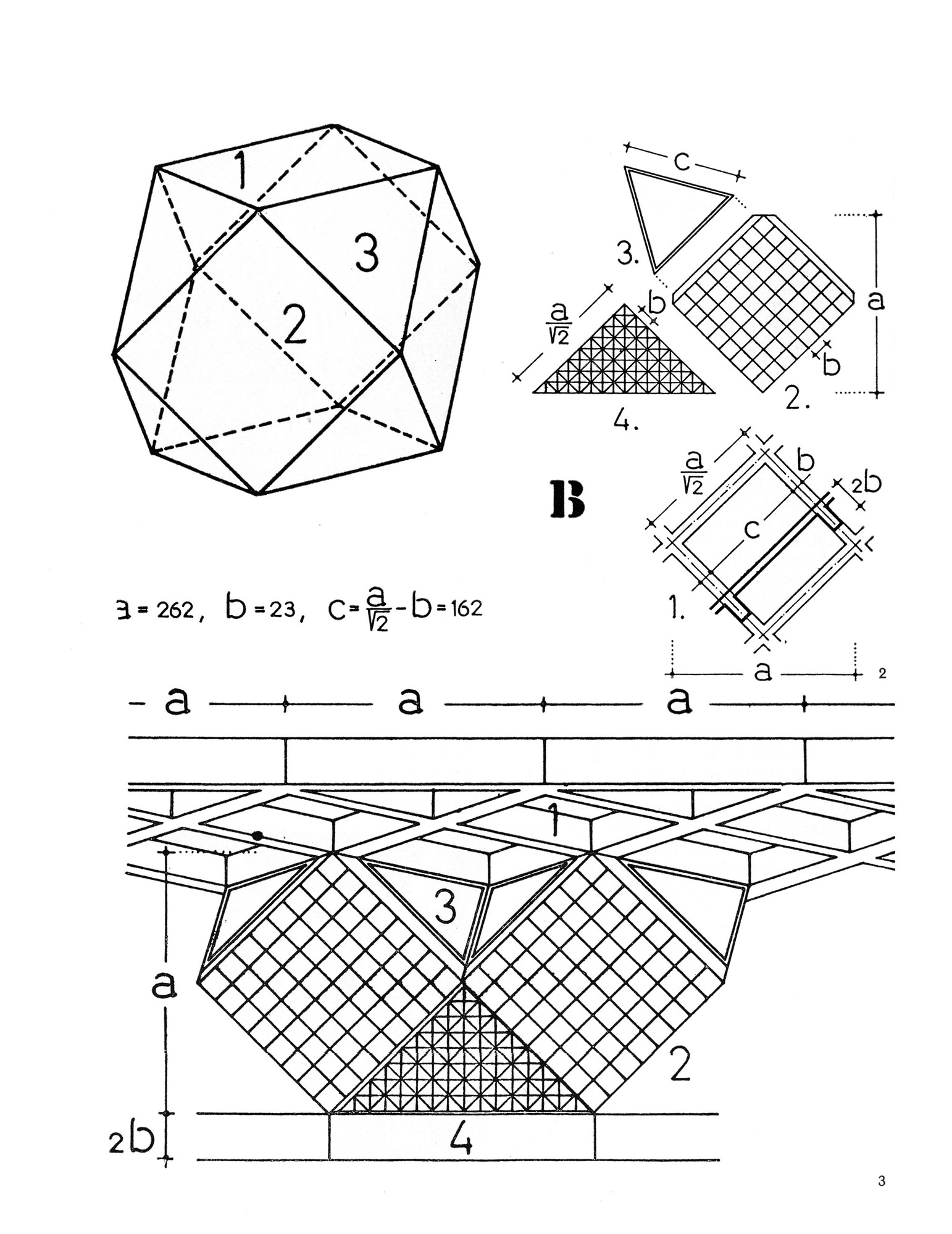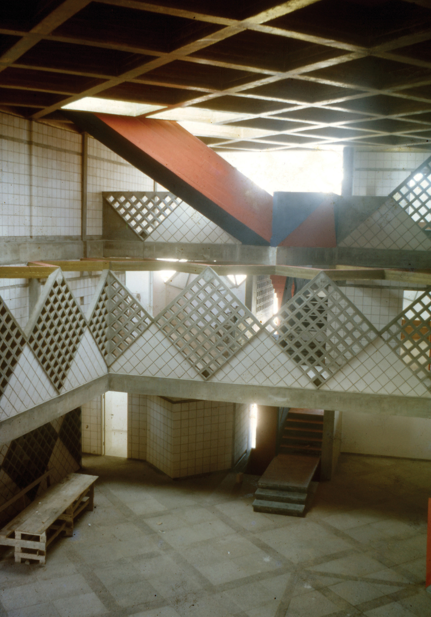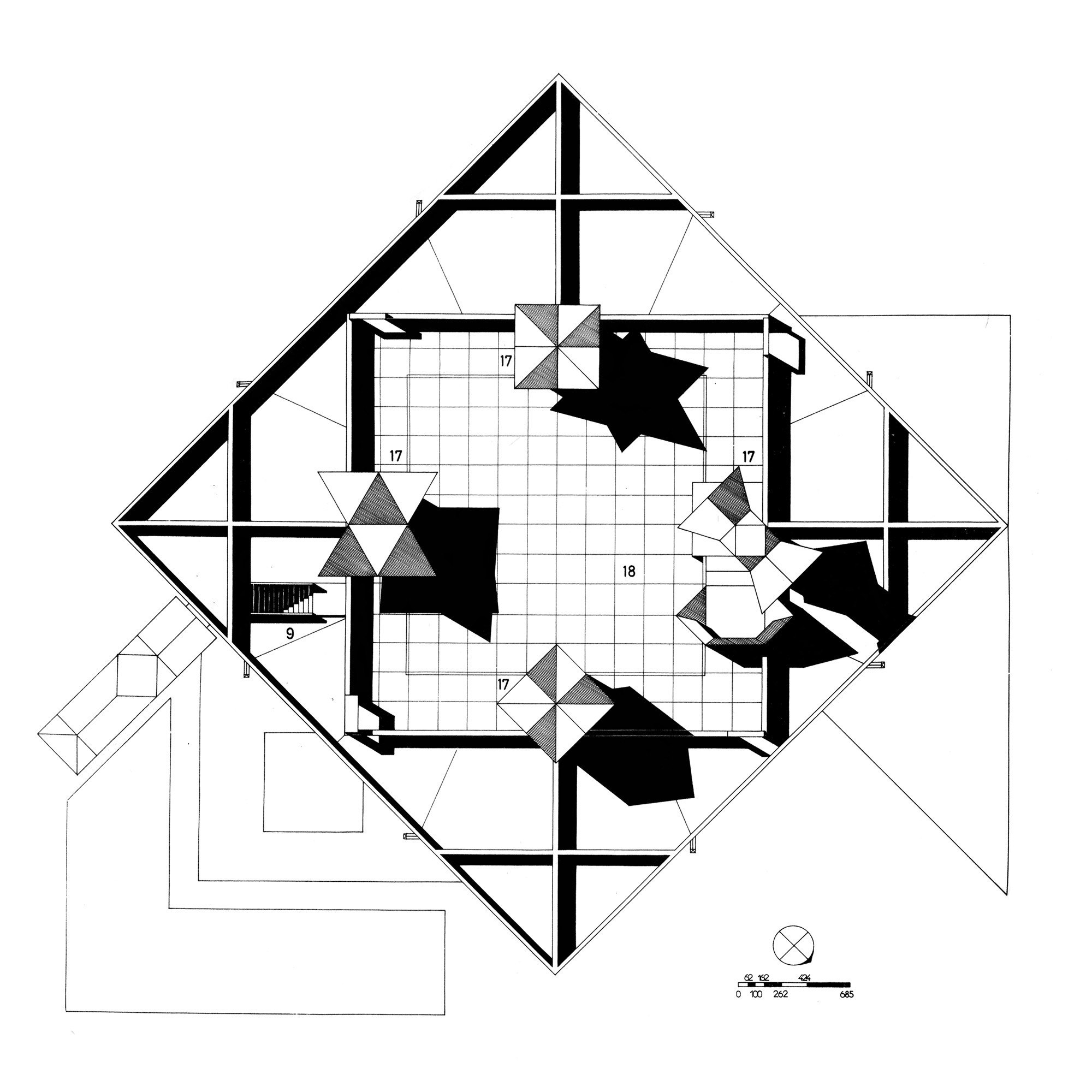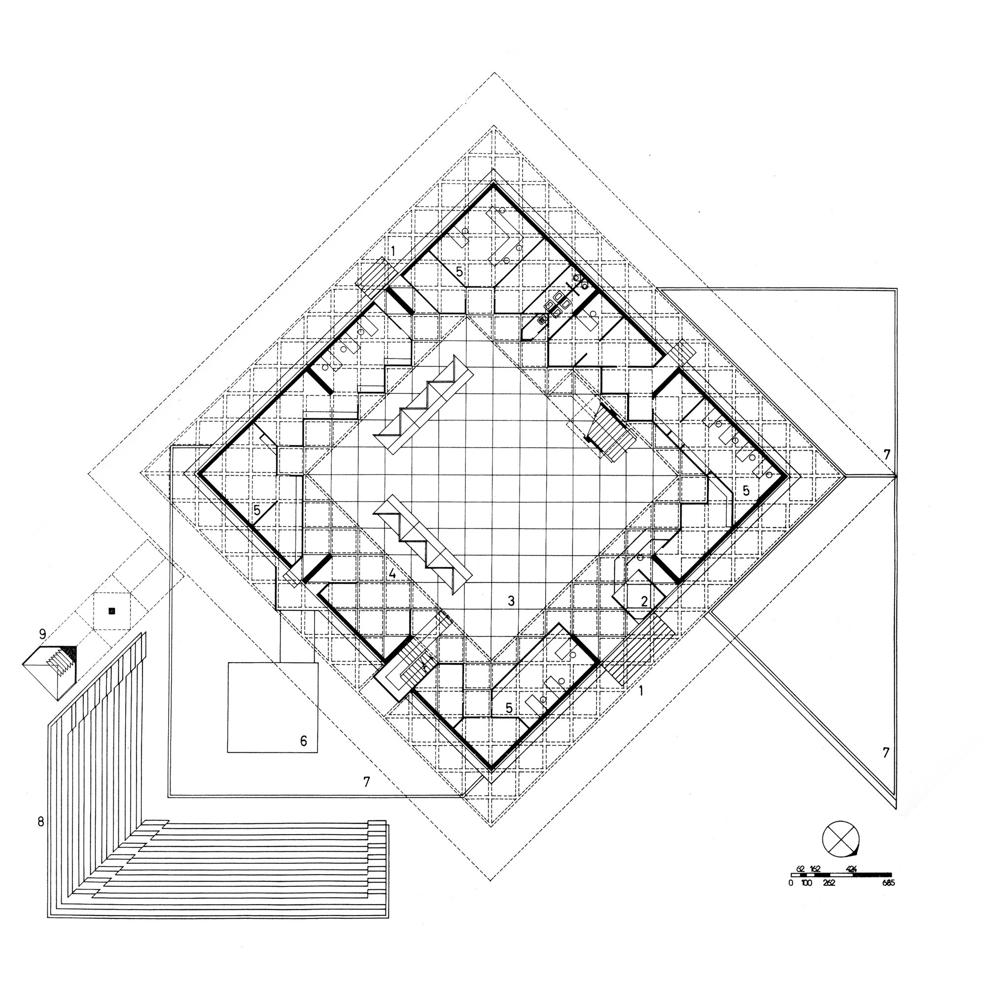 The building is in the shape of an inverted ziggurat built of reinforced concrete, cast in-situ and left natural. The stereometric basic element is based on the shape of a cuboctahedron. The building is supported only by 12 columns. All the floors are in reinforced concrete diagonal ribs, 23 cm wide and 37 cm thick.