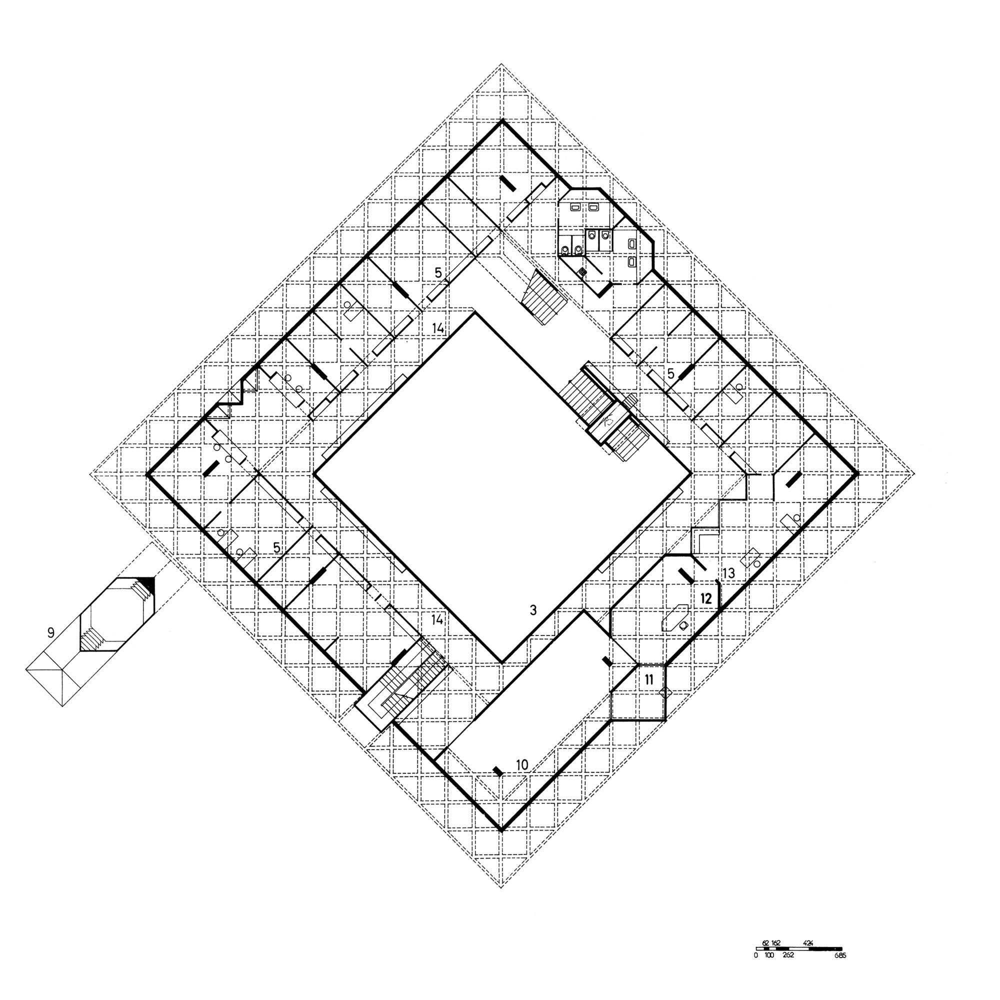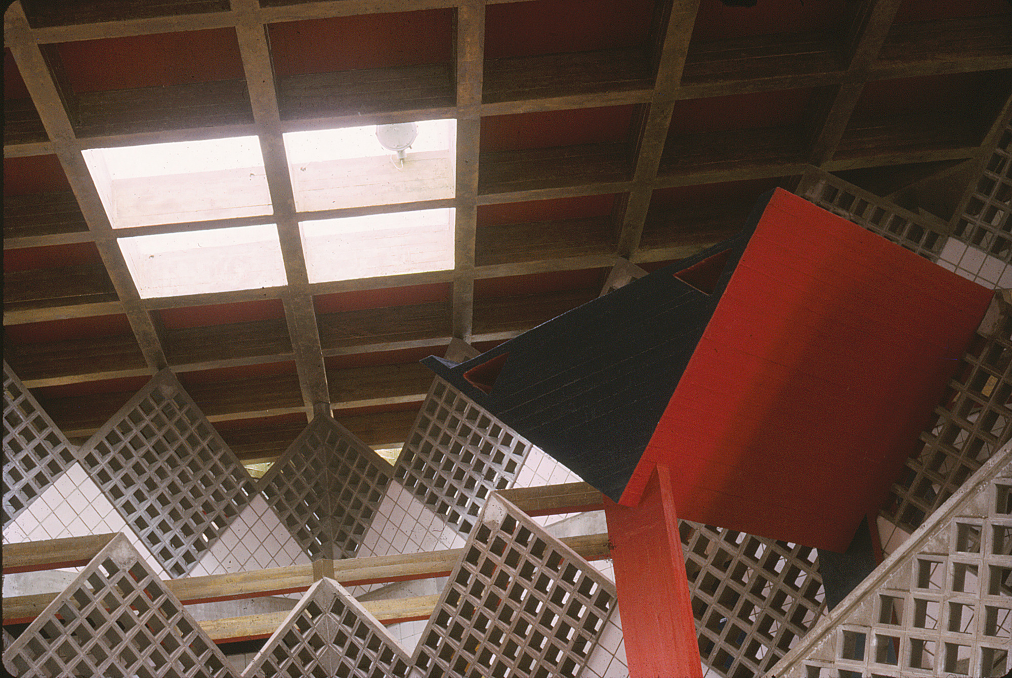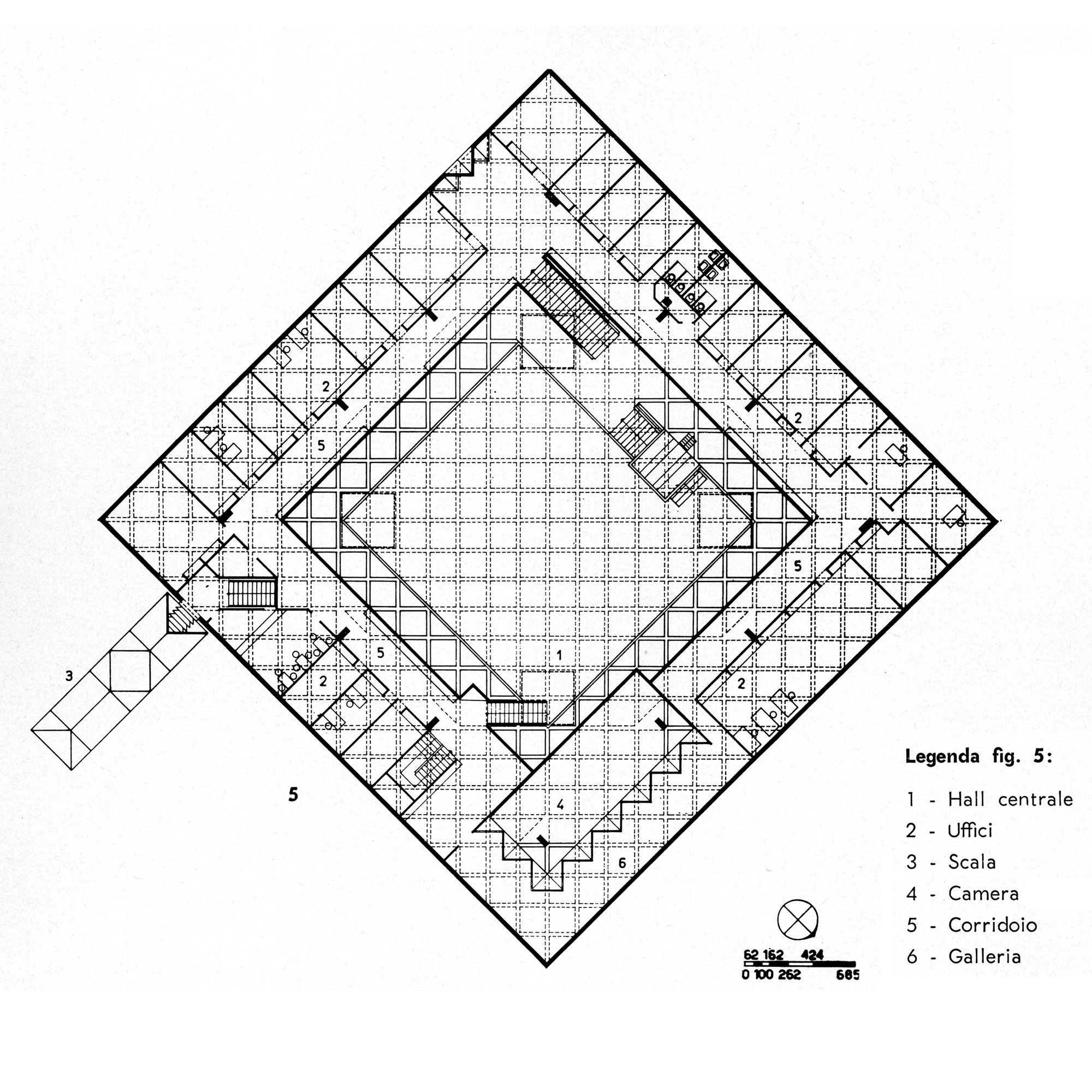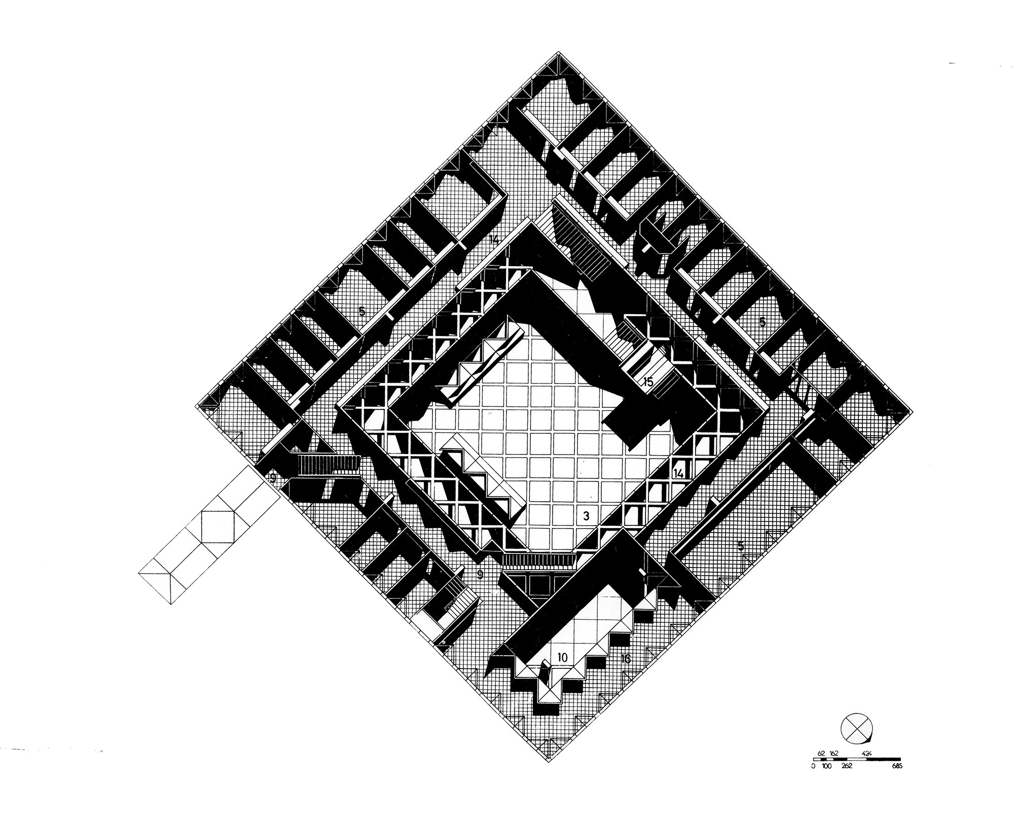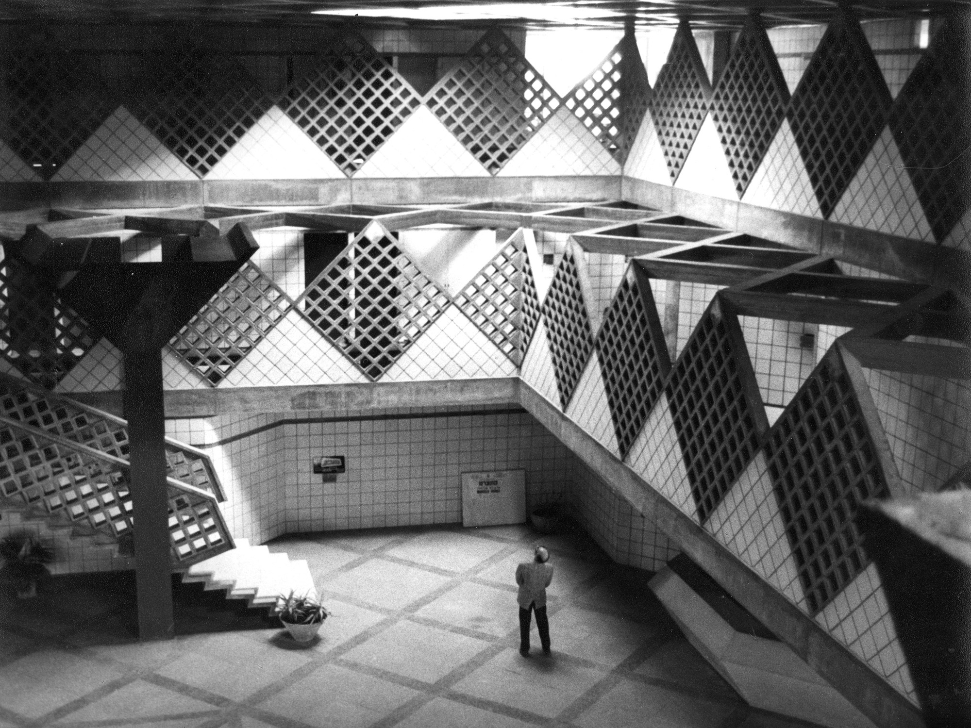 The building is in the shape of an inverted ziggurat built of reinforced concrete, cast in-situ and left natural. The stereometric basic element is based on the shape of a cuboctahedron. The building is supported only by 12 columns. All the floors are in reinforced concrete diagonal ribs, 23 cm wide and 37 cm thick.