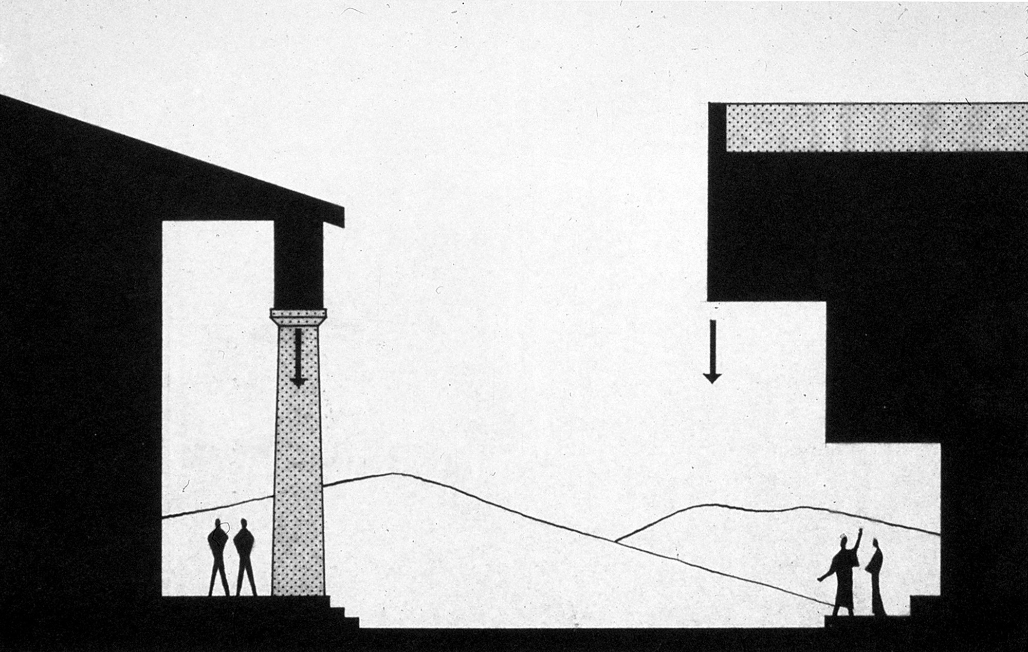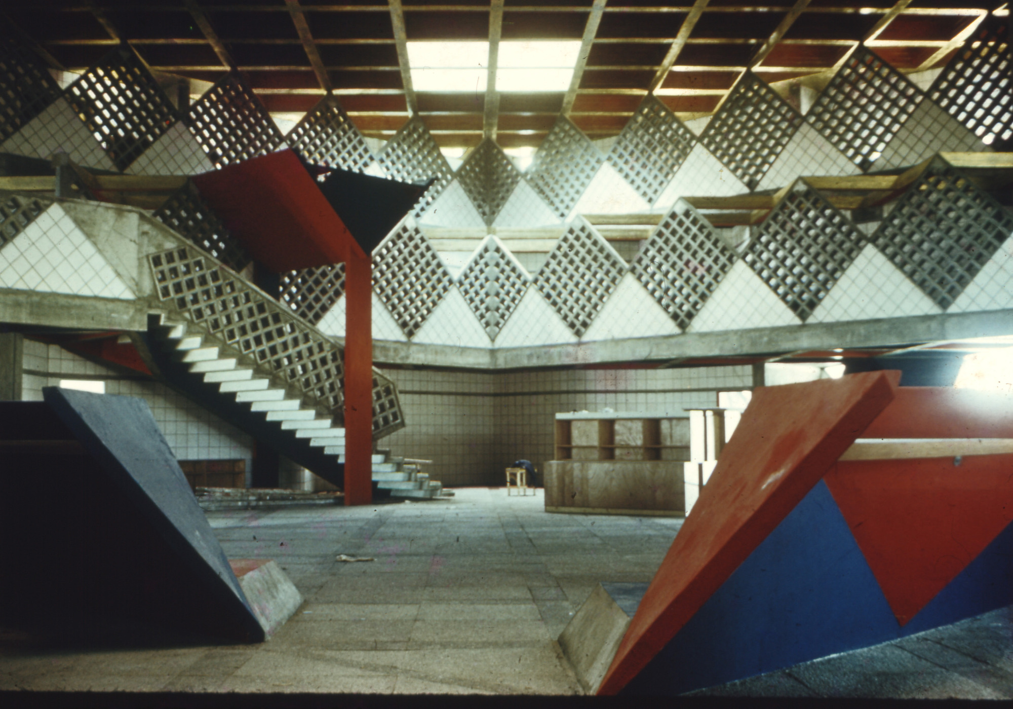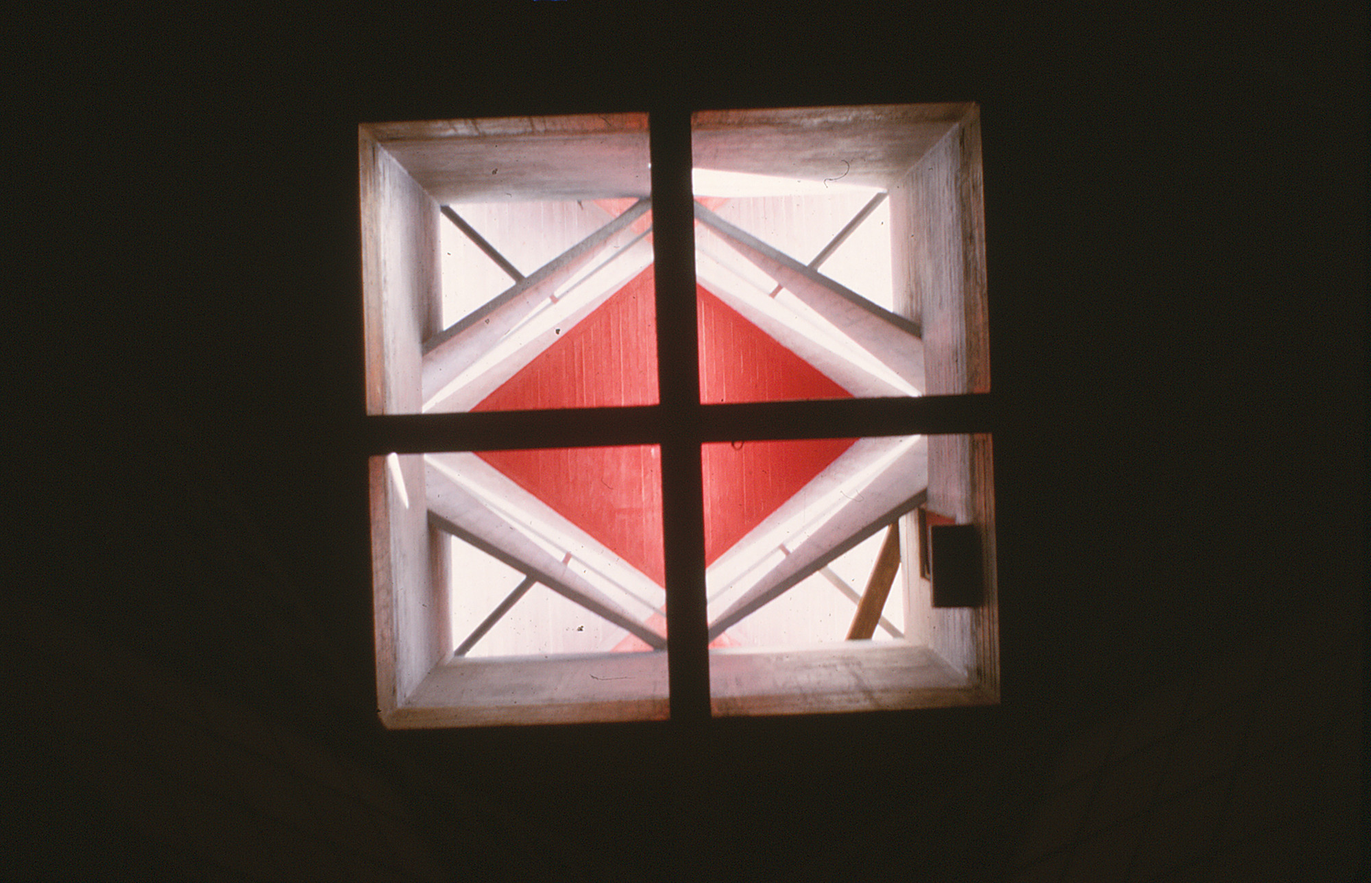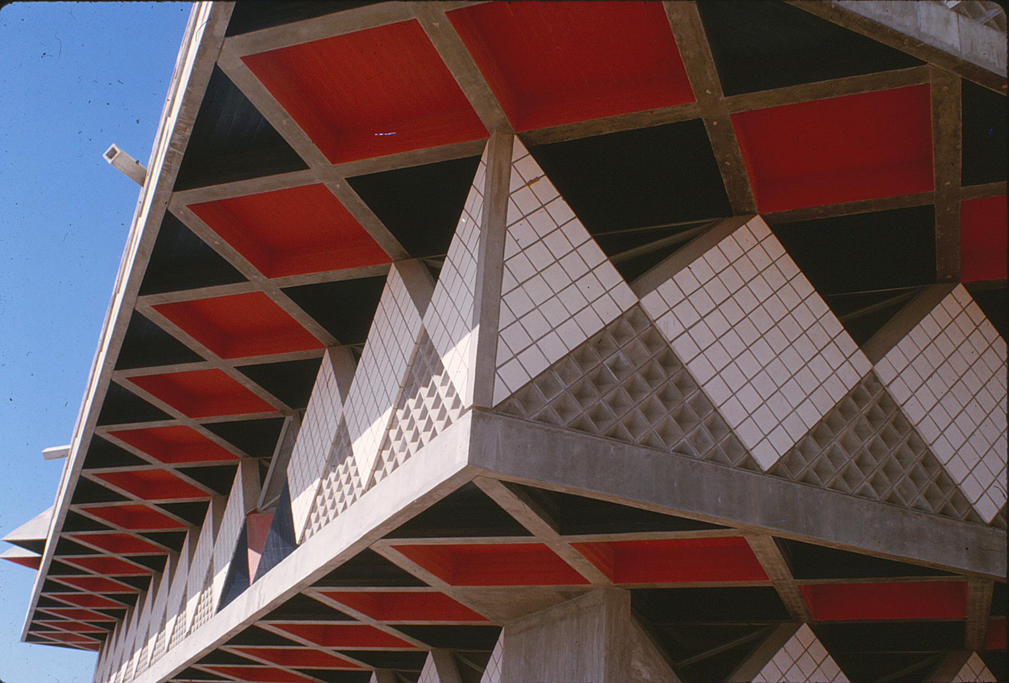 The building is in the shape of an inverted ziggurat built of reinforced concrete, cast in-situ and left natural. The stereometric basic element is based on the shape of a cuboctahedron. The building is supported only by 12 columns. All the floors are in reinforced concrete diagonal ribs, 23 cm wide and 37 cm thick.