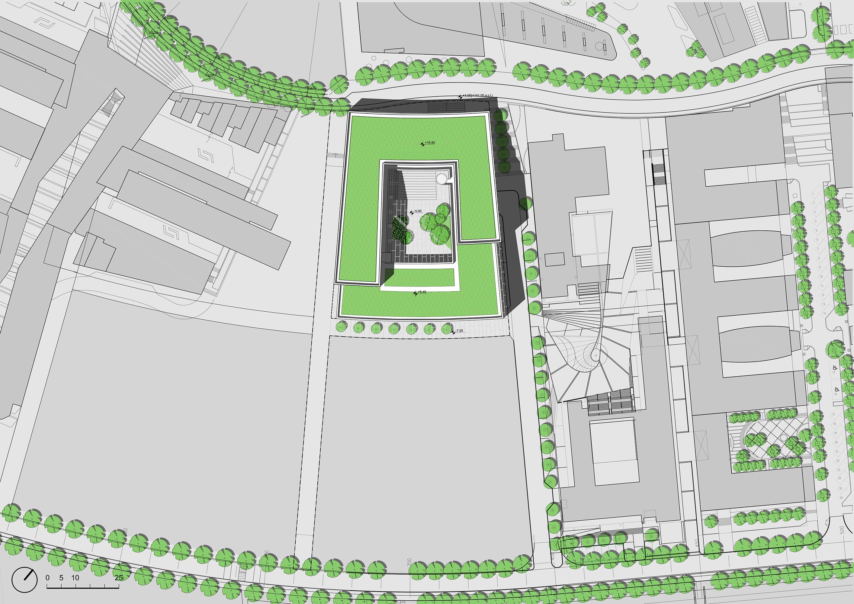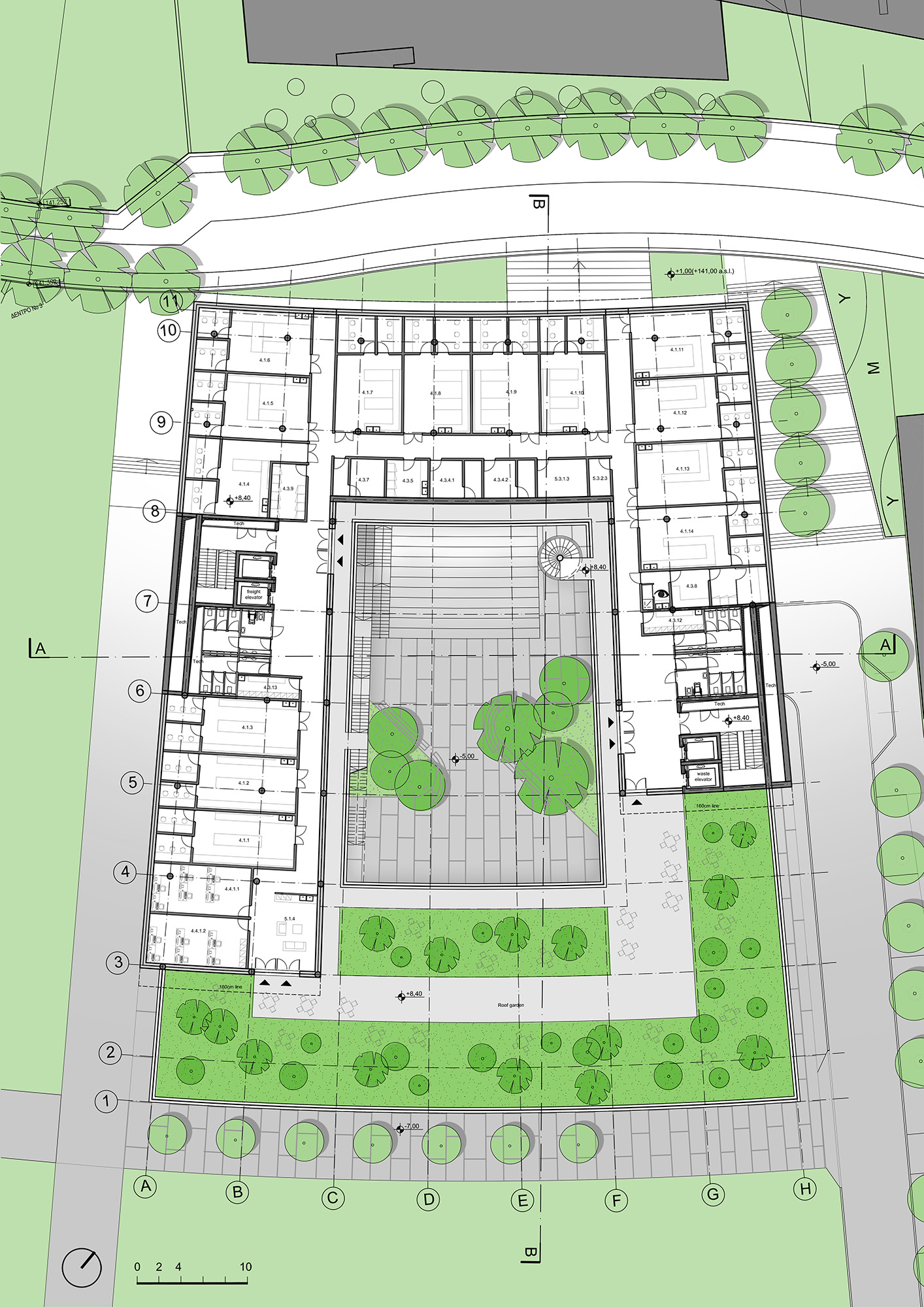 The 2nd floor gives access to a gallery surrounding the central courtyard and connecting to the open roof garden which is linked via the external stair to the courtyard. Circulation spaces and meeting areas provide attractive views to and from the courtyard on different levels and emphasize the importance of this public space.