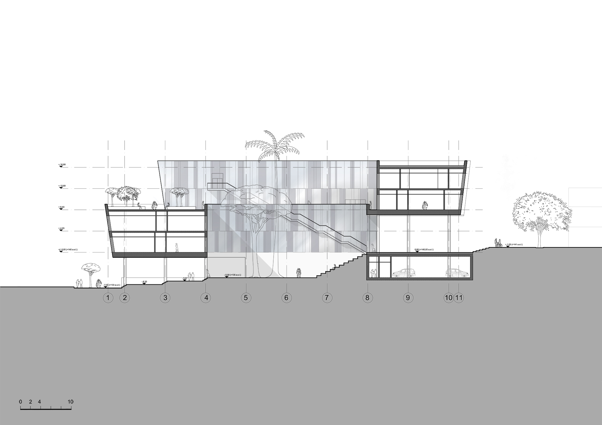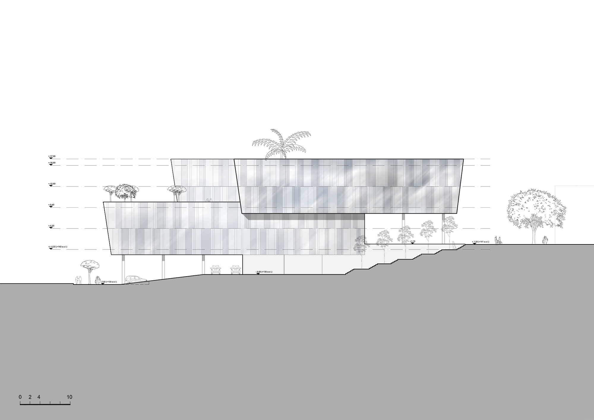 The building can be accessed from the Belvedere where the main entrance is located at Ground floor level underneath the overhang. When students access the building from the south they will pass the central courtyard and enter the wide stairs of the courtyard to the main entrance. The garage and external parking spaces have direct access to a lift.