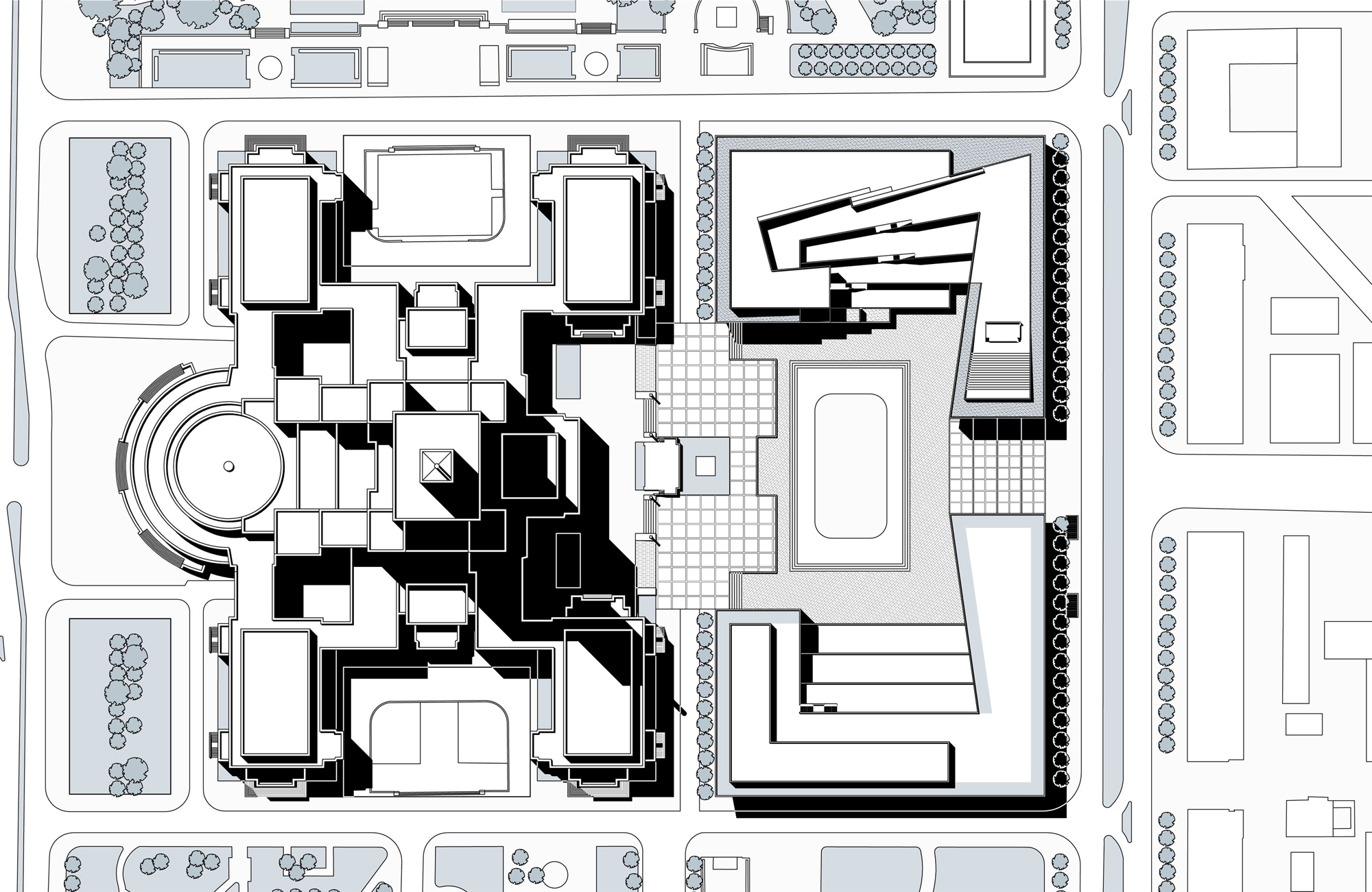 The site for the new Museum of Art in Warsaw is near the foot of the Palace of Culture, at the crucial intersection of the city grids. The overlapping geometries of the city and the character of the site are engaged in the architecture of the Museum. The Museum is part of its particular urban situation in its effort to form a meaningful public space rather than become an architectural object.