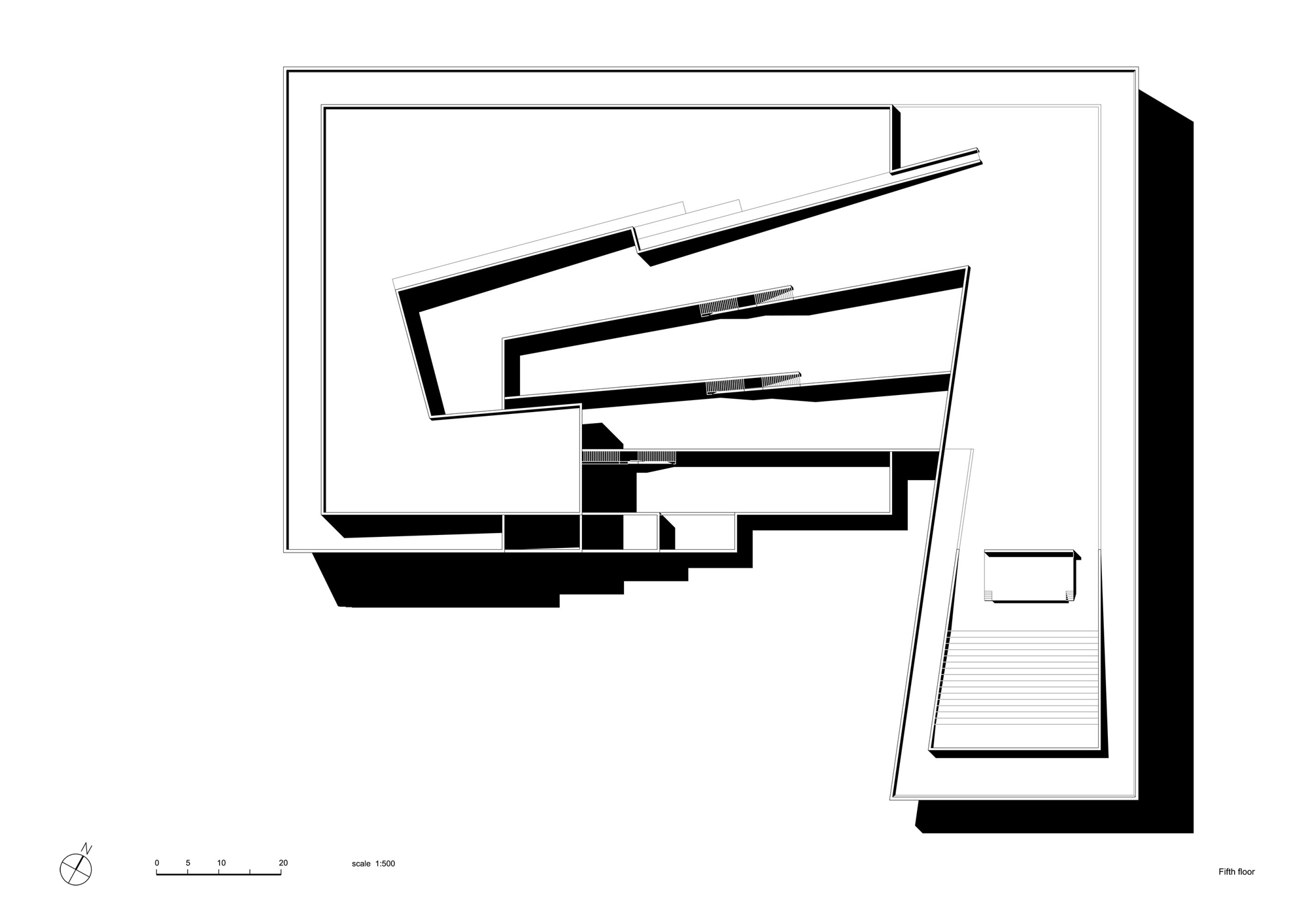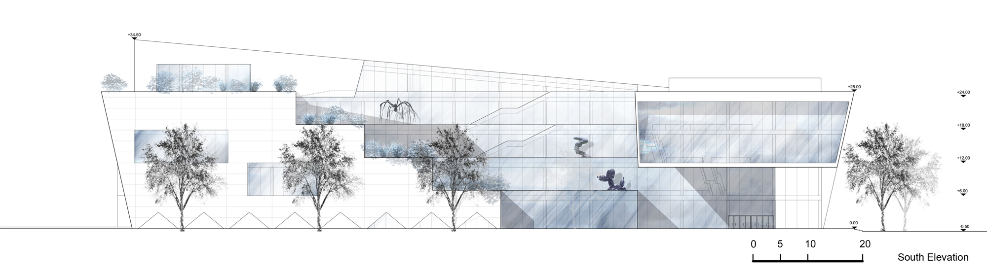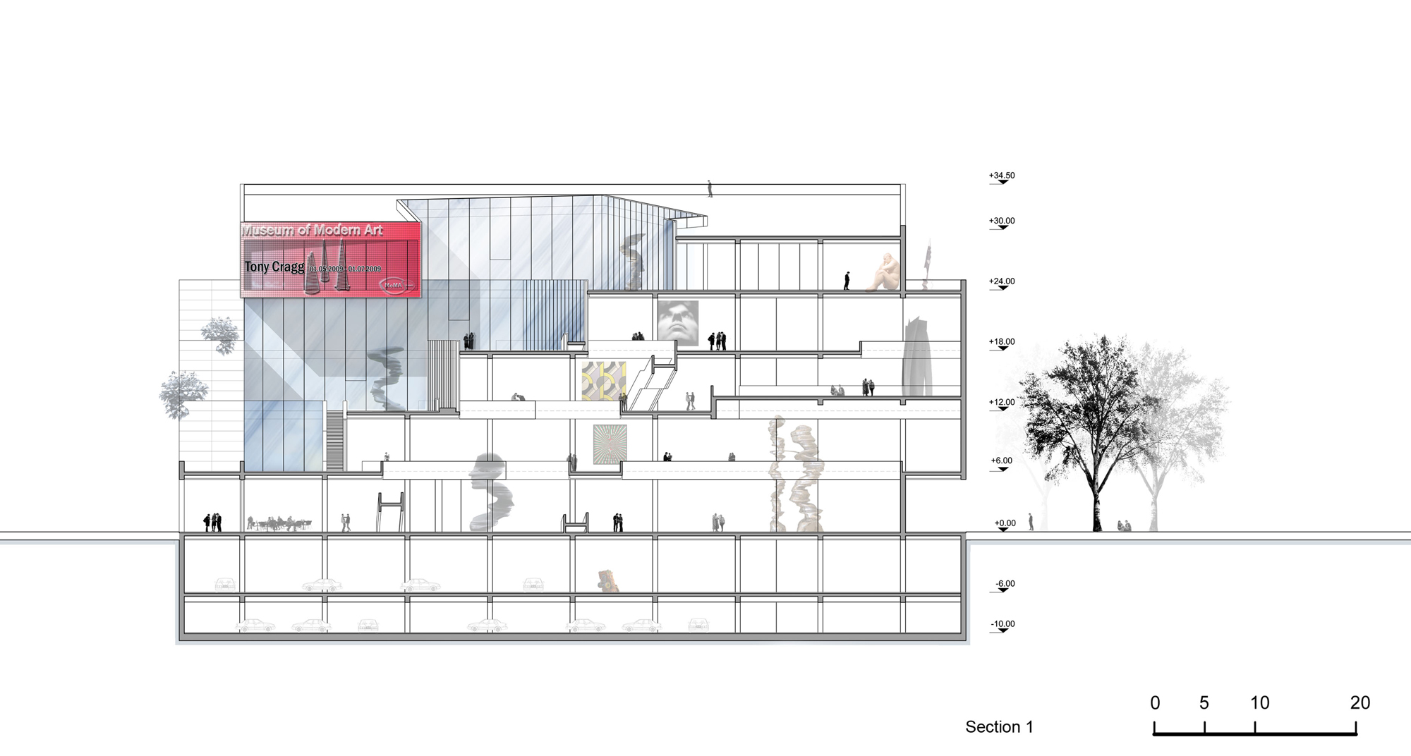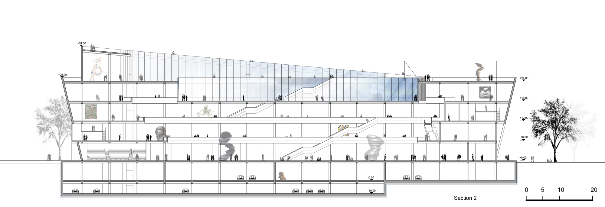 In the new museum, the art exhibition section and business-commercial facilities are separated and clearly expressed. The museum is organised around a central atrium, whilst the business-commercial part takes the form of a forcefully projecting arm over the museum's main entrance.