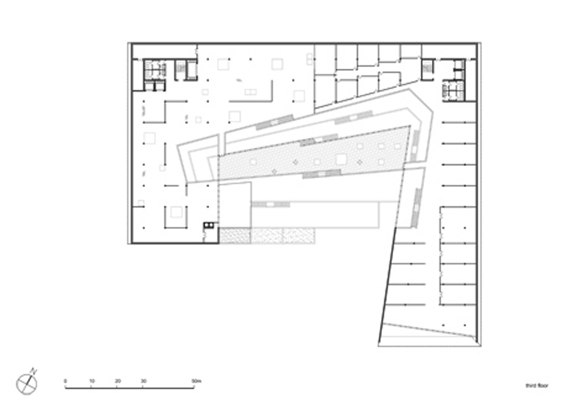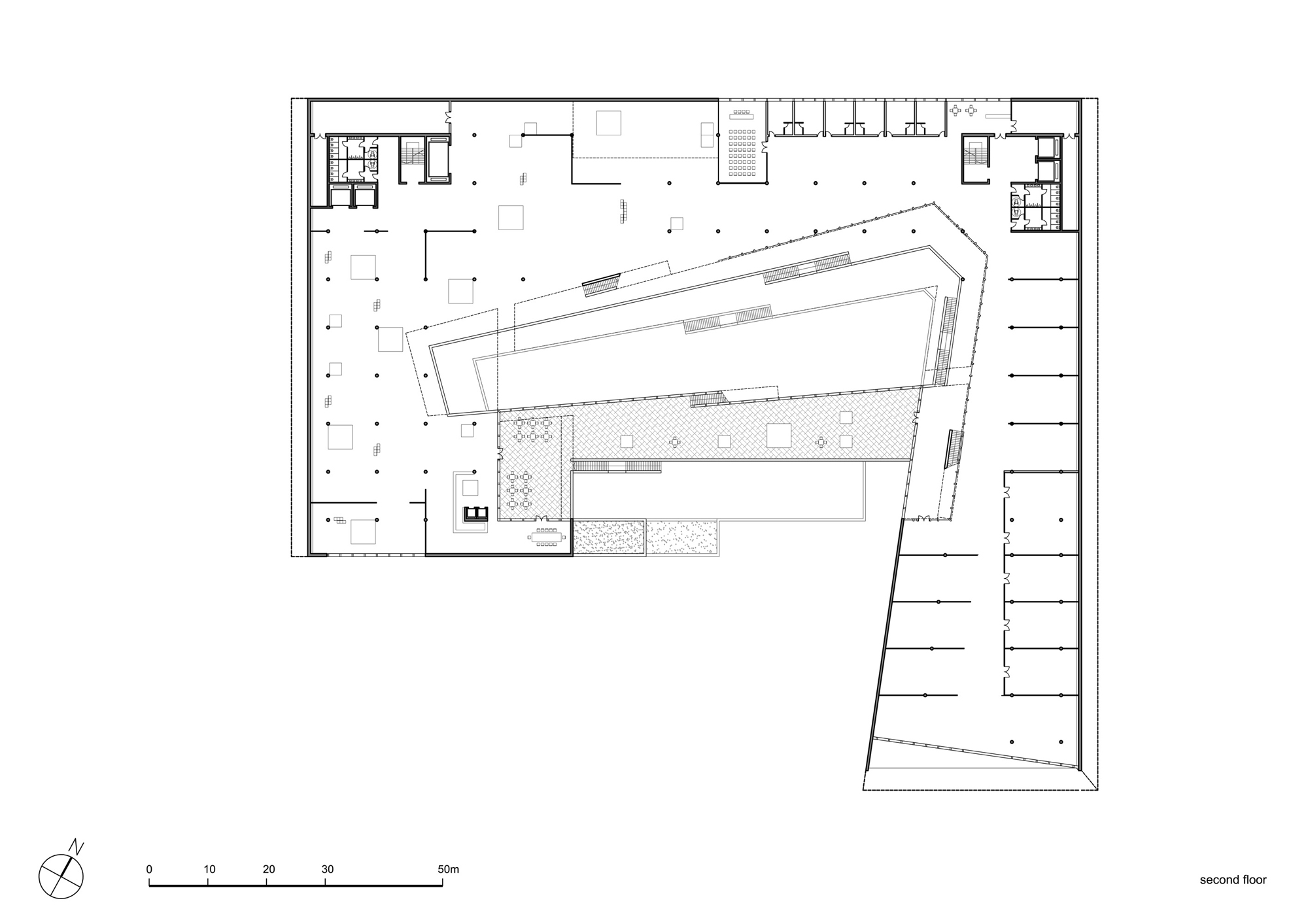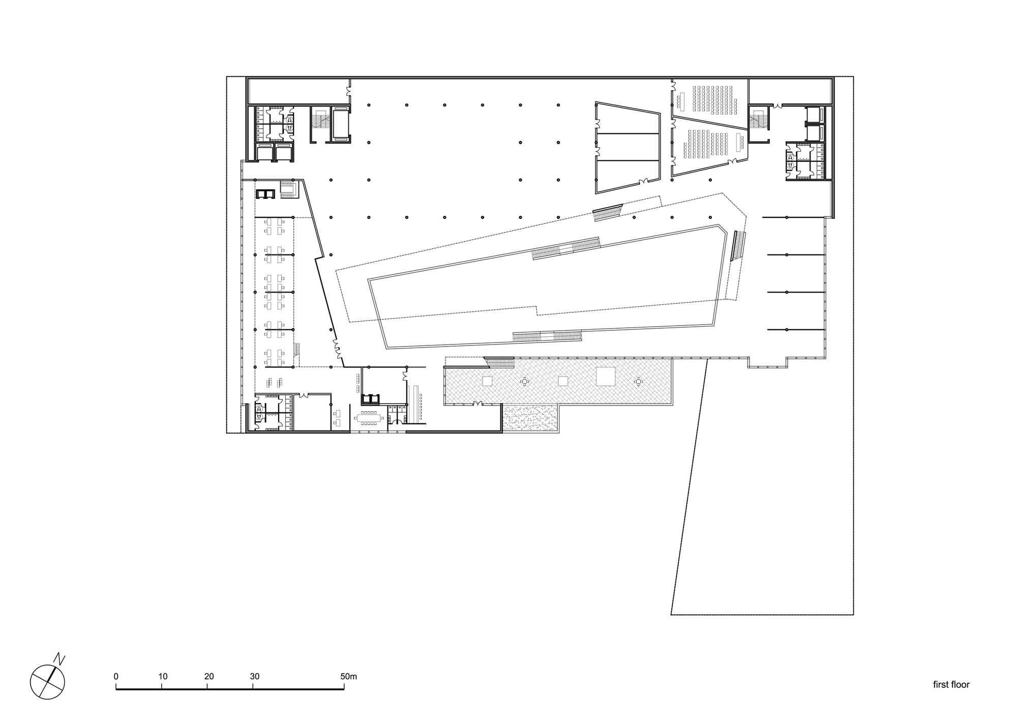 In the new museum, the art exhibition section and business-commercial facilities are separated and clearly expressed. The museum is organised around a central atrium, whilst the business-commercial part takes the form of a forcefully projecting arm over the museum's main entrance.