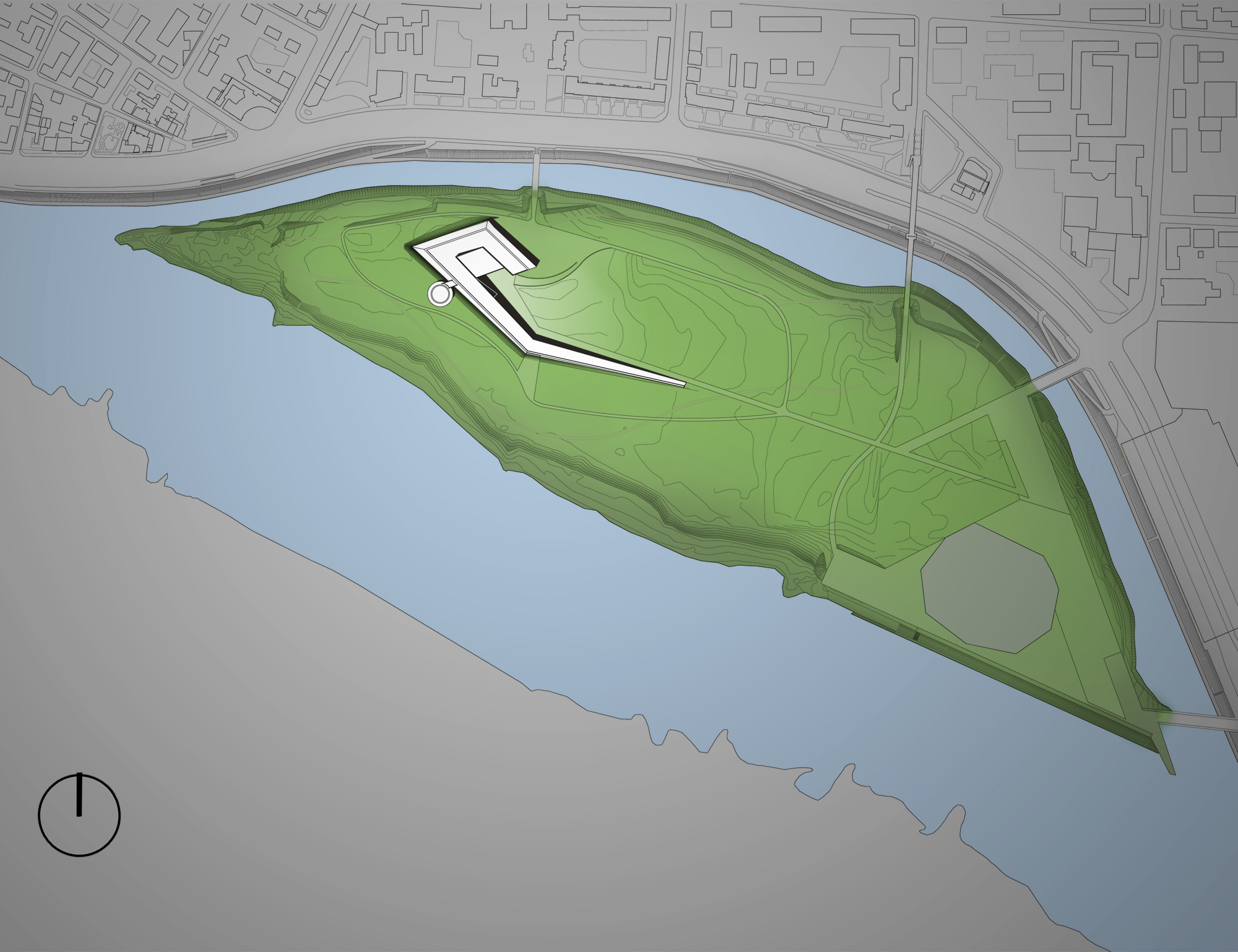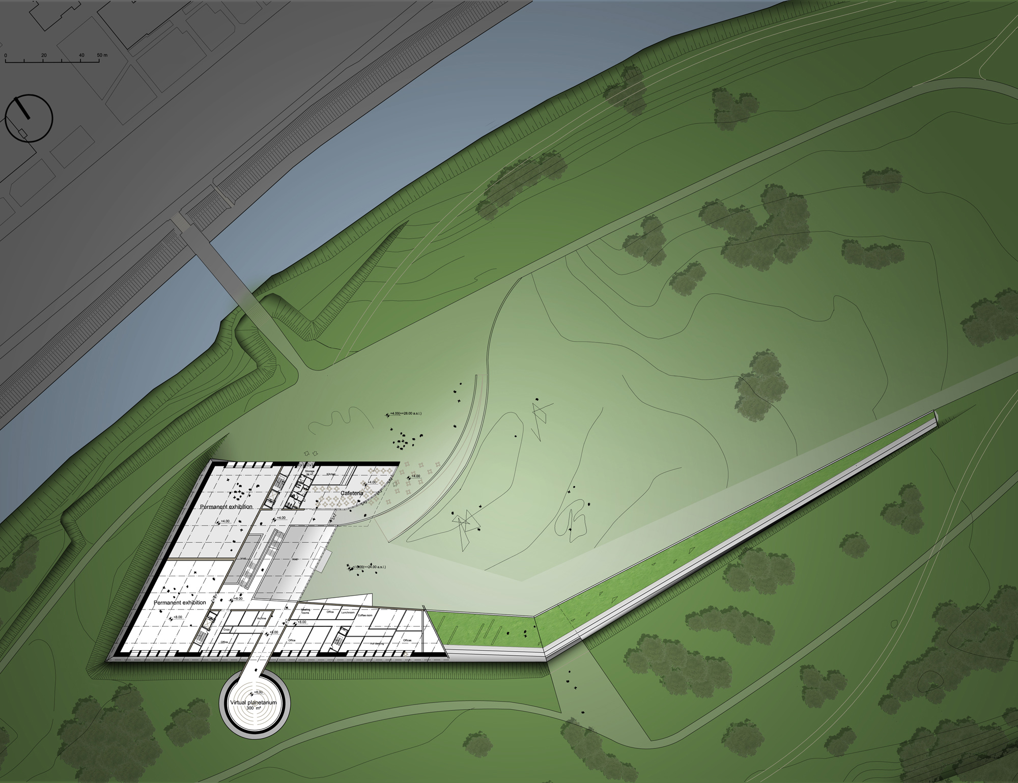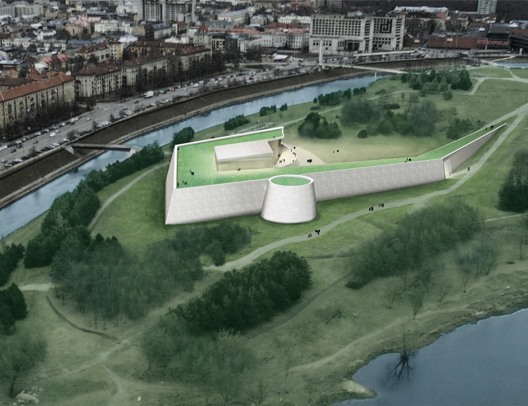 The Science and Innovation Centre on the Nemunas Island in Kaunas is a landscape responding to Nemunas Island natural situation and its topography, to the presence of Nemunas River and to the skyline of Kaunas City.