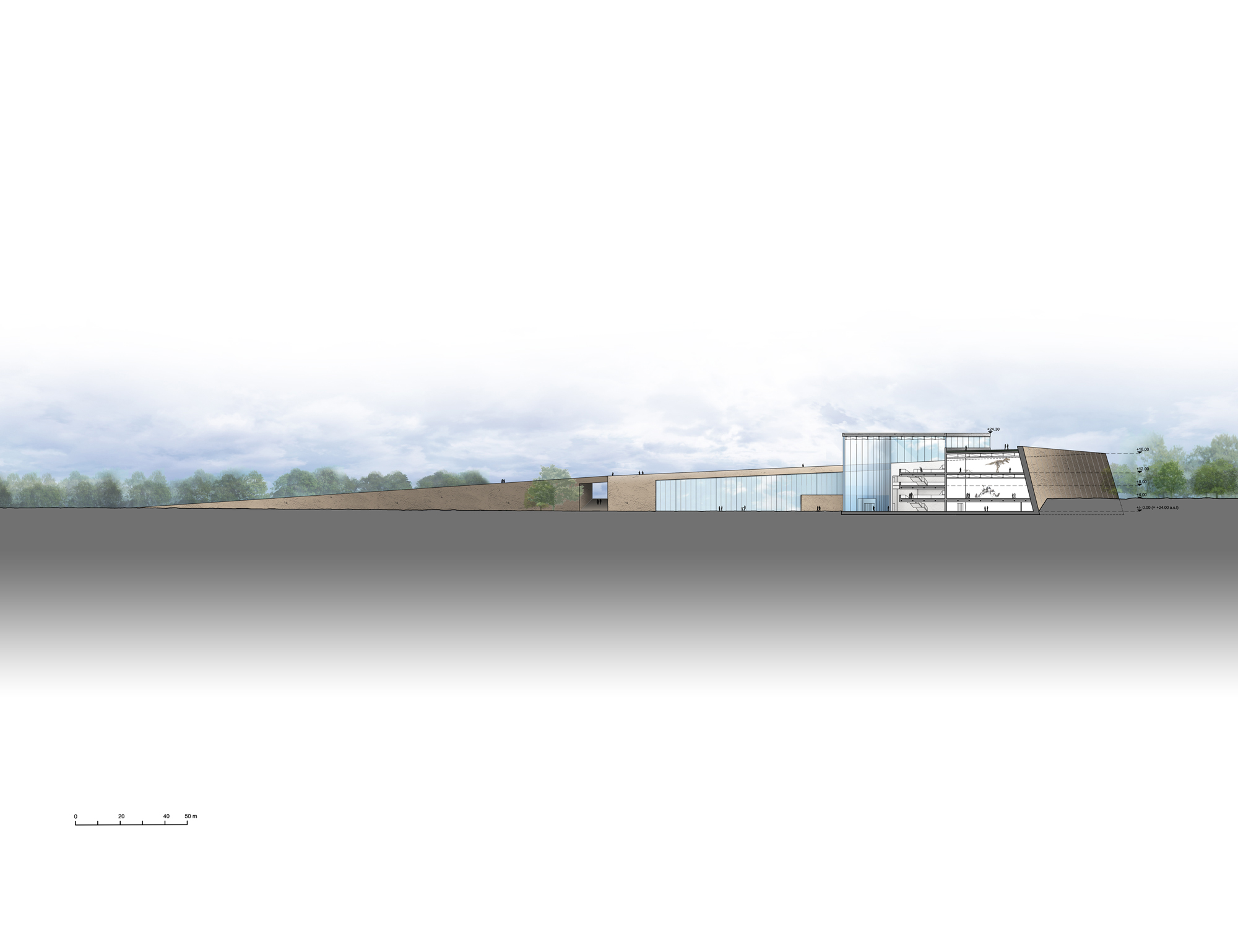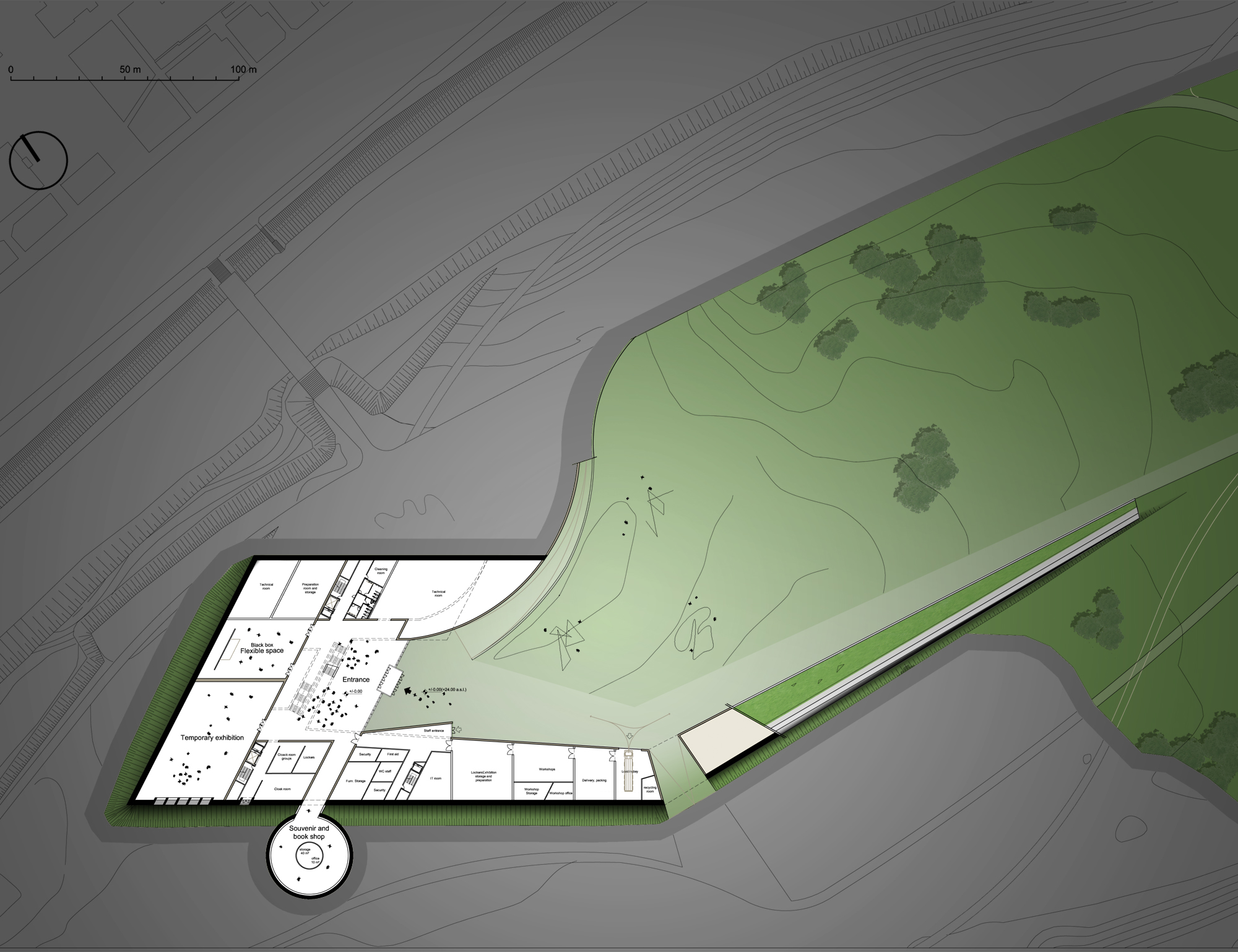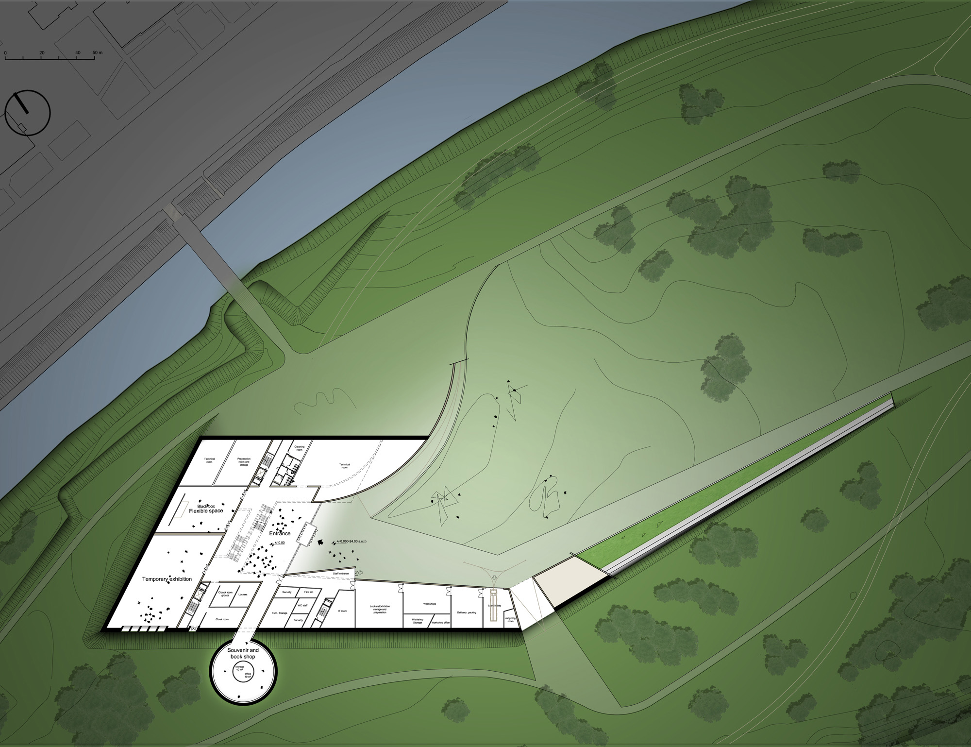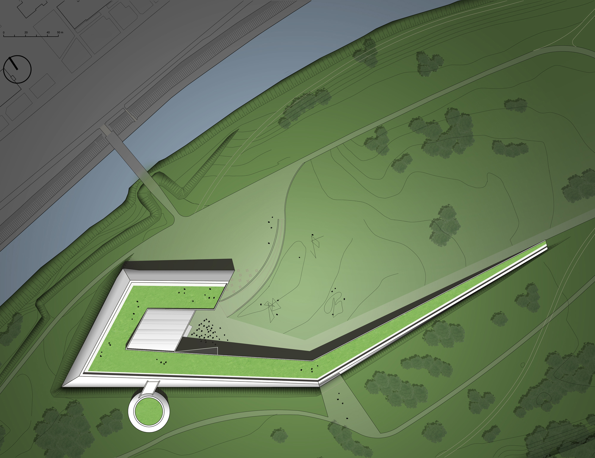 The Science and Innovation Centre on the Nemunas Island in Kaunas is a landscape responding to Nemunas Island natural situation and its topography, to the presence of Nemunas River and to the skyline of Kaunas City.
